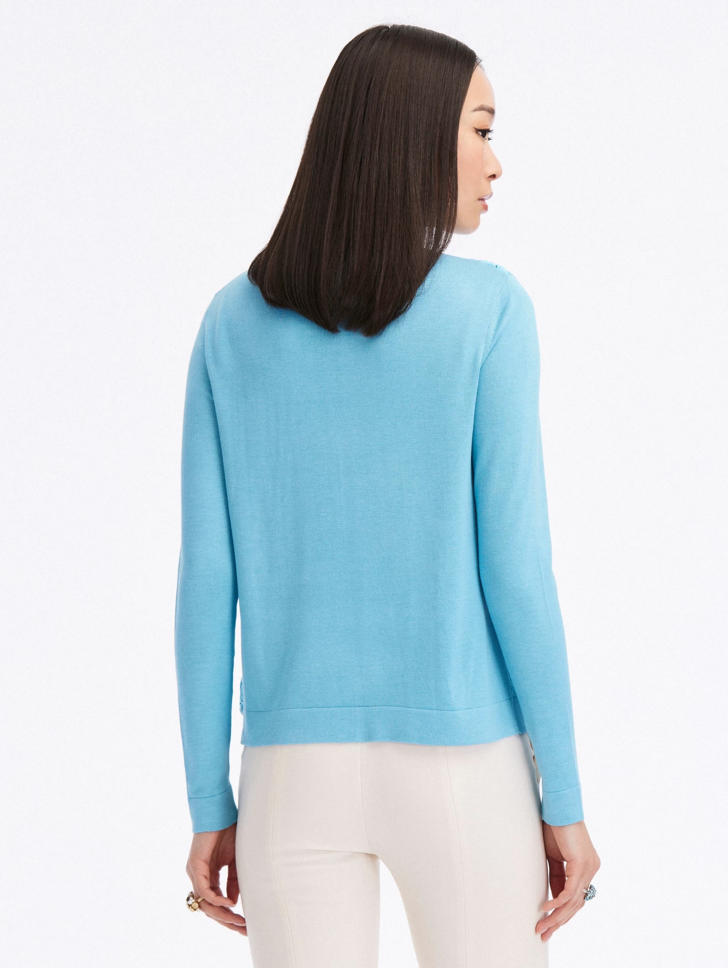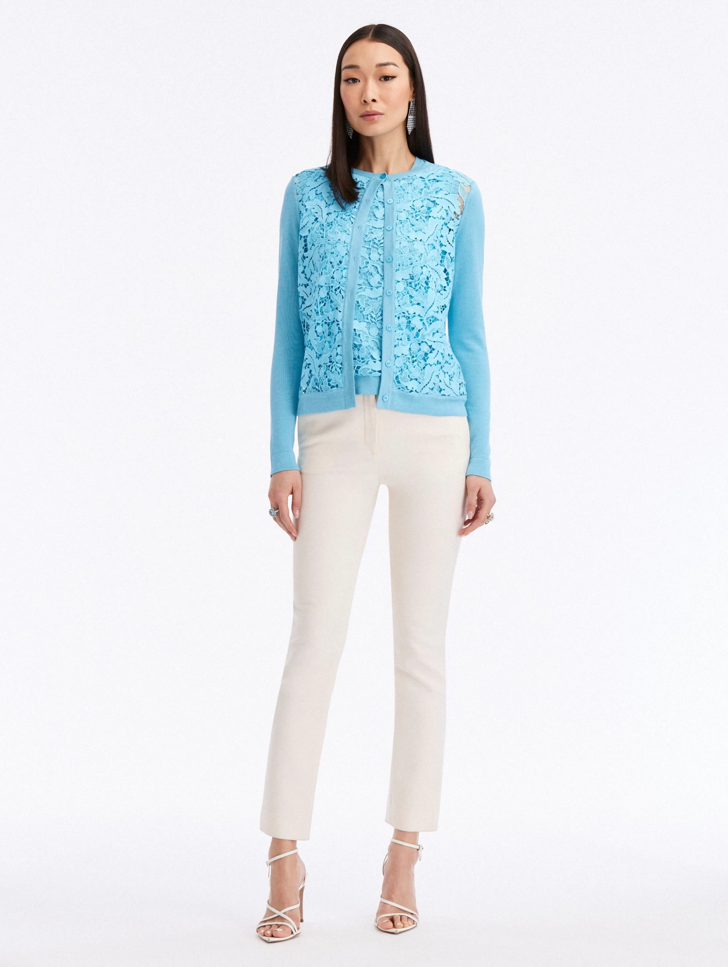 Cut in a vibrant shade of aqua, this cardigan is knit with lined, acorn guipure lace panels. This classic knit is the perfect pairing for color-complementary separates or it’s coordinating top.