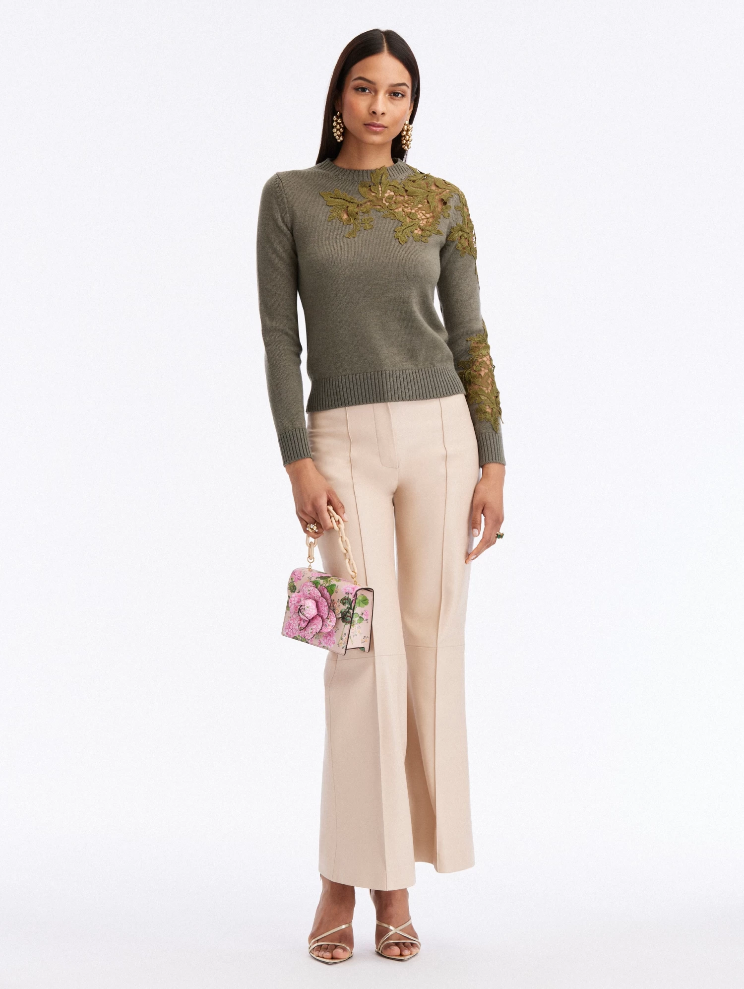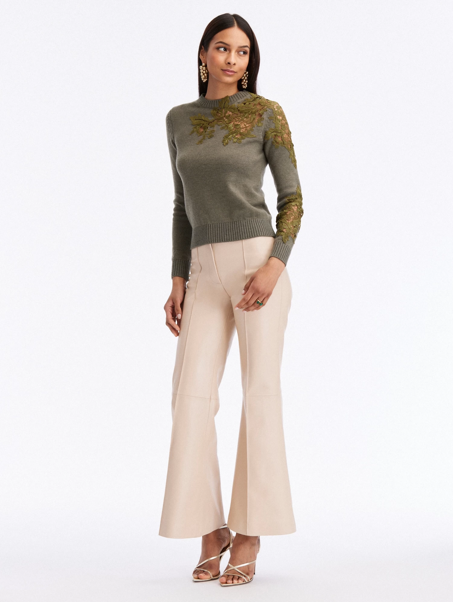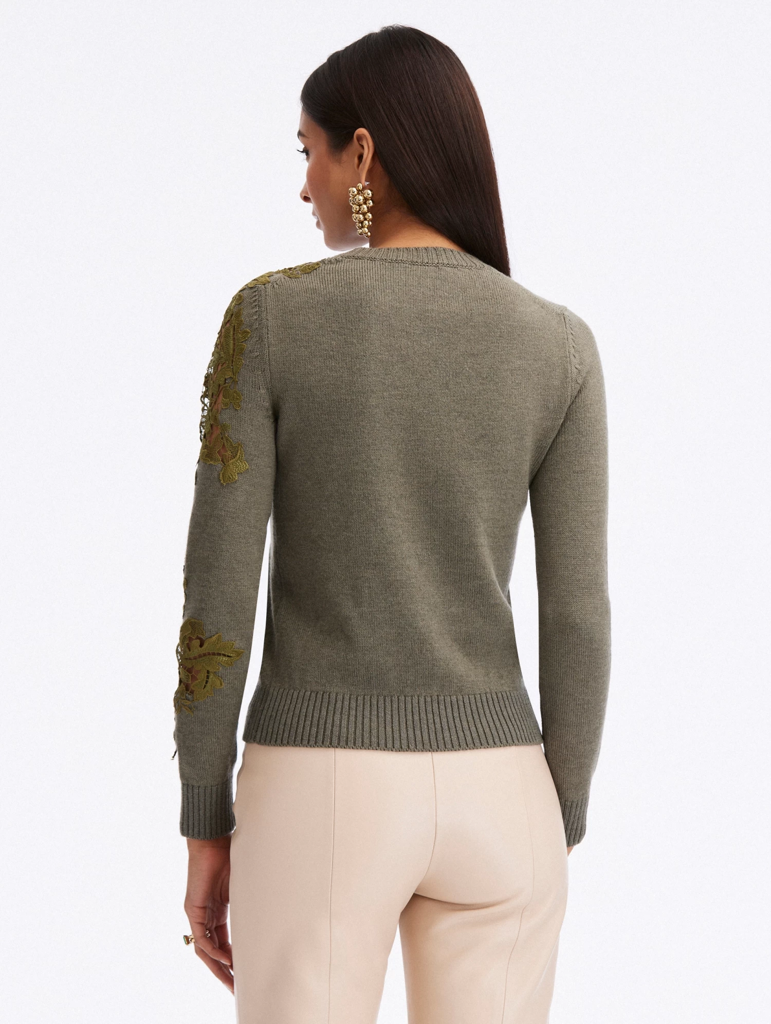 Knit from olive-hued wool, this pullover is elevated by perfectly placed acorn guipure lace insets at the chest and sleeve.