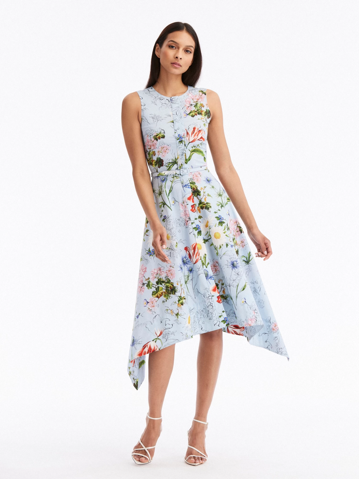 Crisp cotton poplin is the canvas for this season’s painterly ‘unfinished’ floral motif. This midi dress boasts an asymmetrical hem and features a concealed button front.