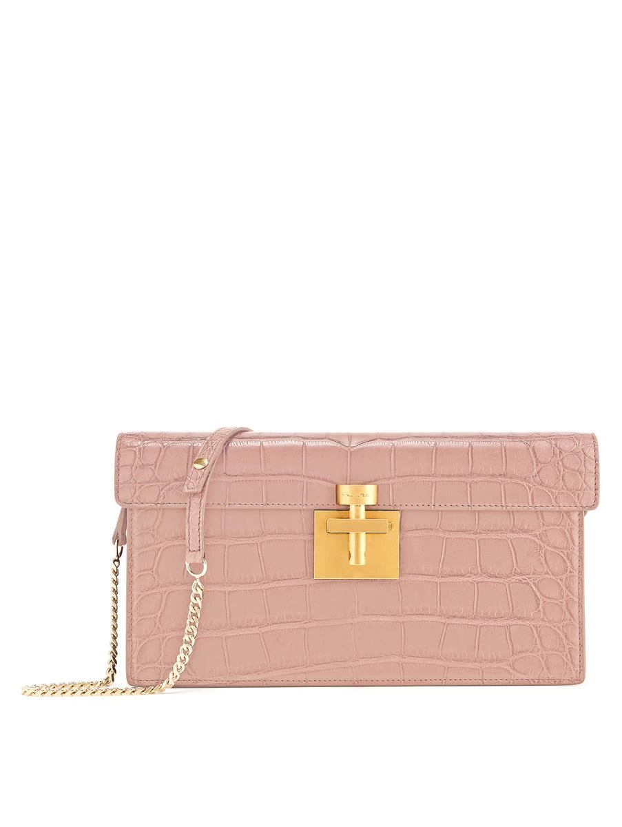 The Alibi clutch captures Oscar de la Renta’s inherently elegant style. This glossy blush alligator version is finished with leather details and a gold clasp.