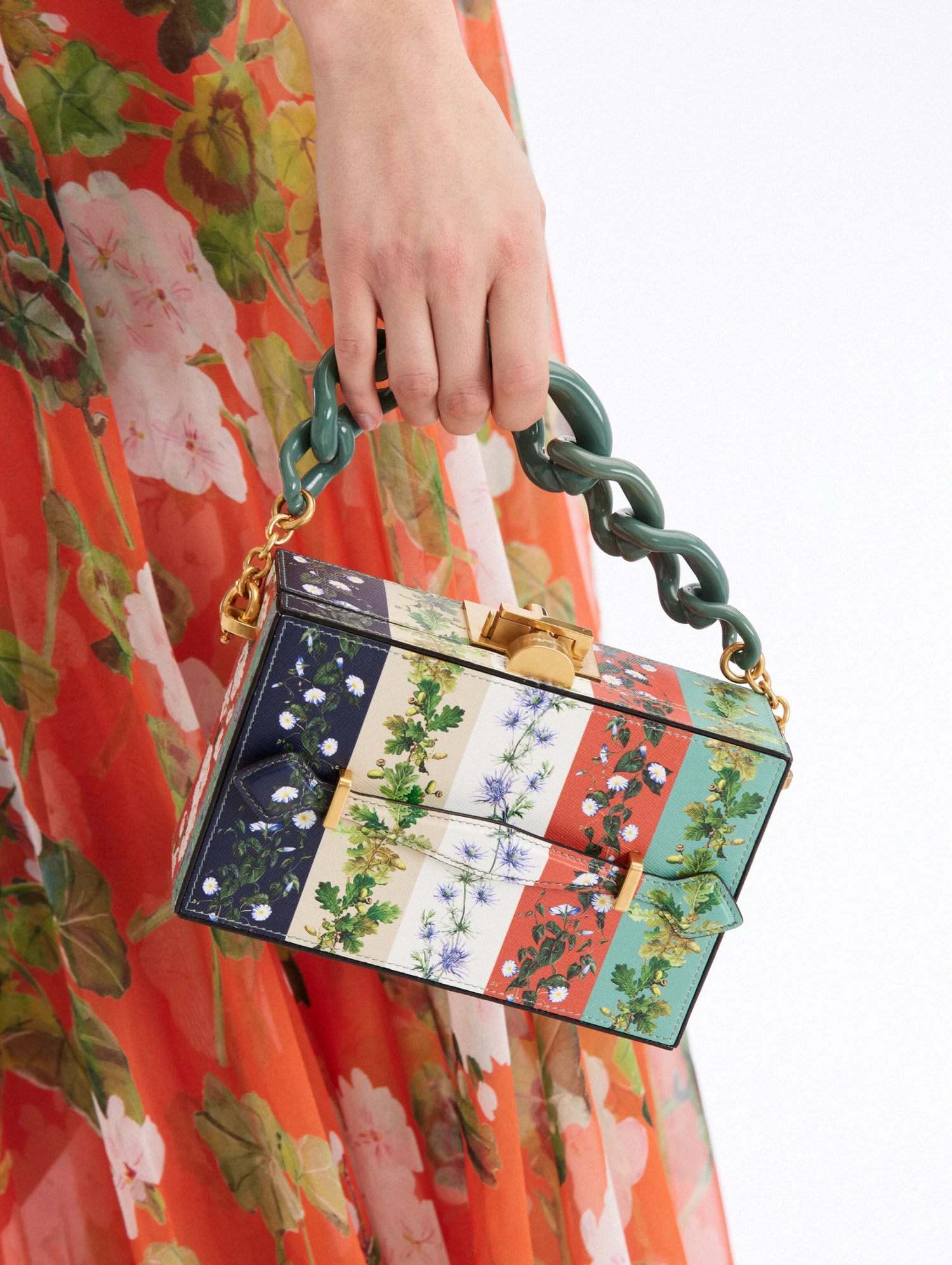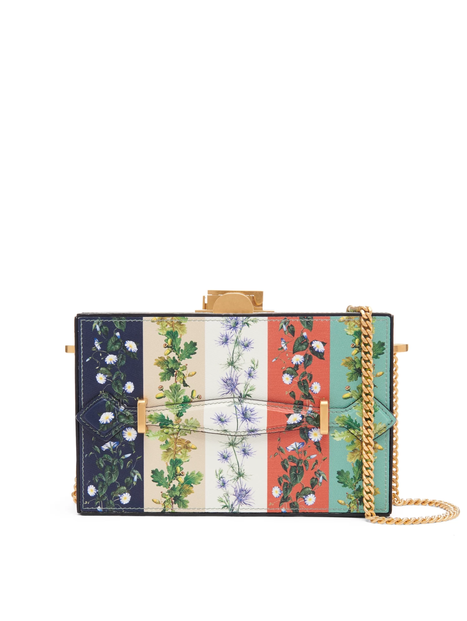The Alibi minaudiere is crafted from botanical stripe printed leather in a structured silhouette with a statement chain-link strap and gold tone hardware.