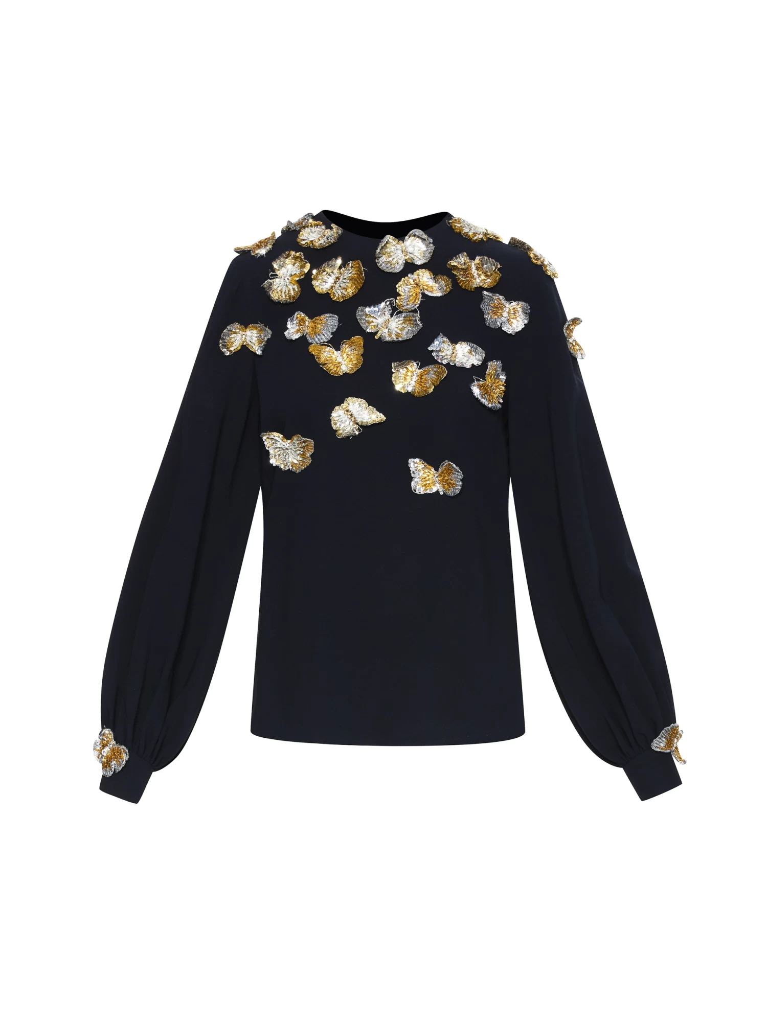 Sequin embroidered butterflies skim across the shoulders of this blouse. With voluminous sleeves and a relaxed silhouette, this top bold captures the imagination seen in the Spring 2023 Collection.