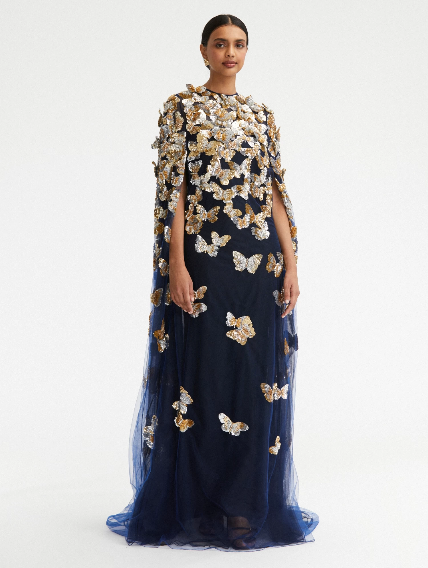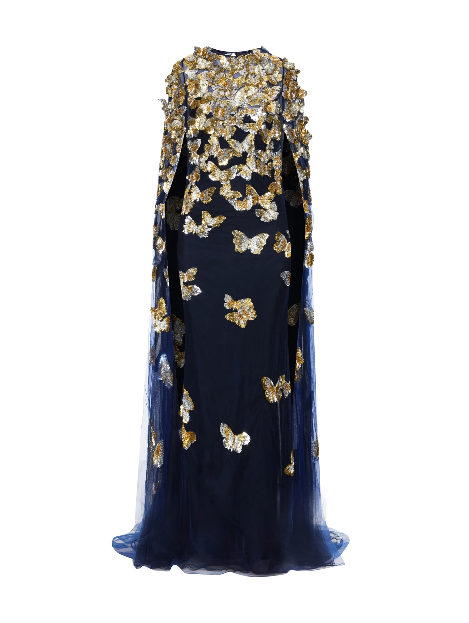 Sequin embroidered butterflies float through this illusion tulle caftan. With a floor-sweeping hemline and lighter-than-air construction, this piece captures the imagination seen in the Spring 2023 Collection.