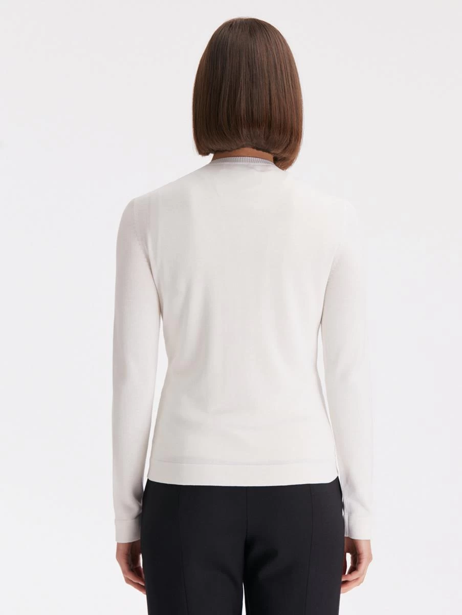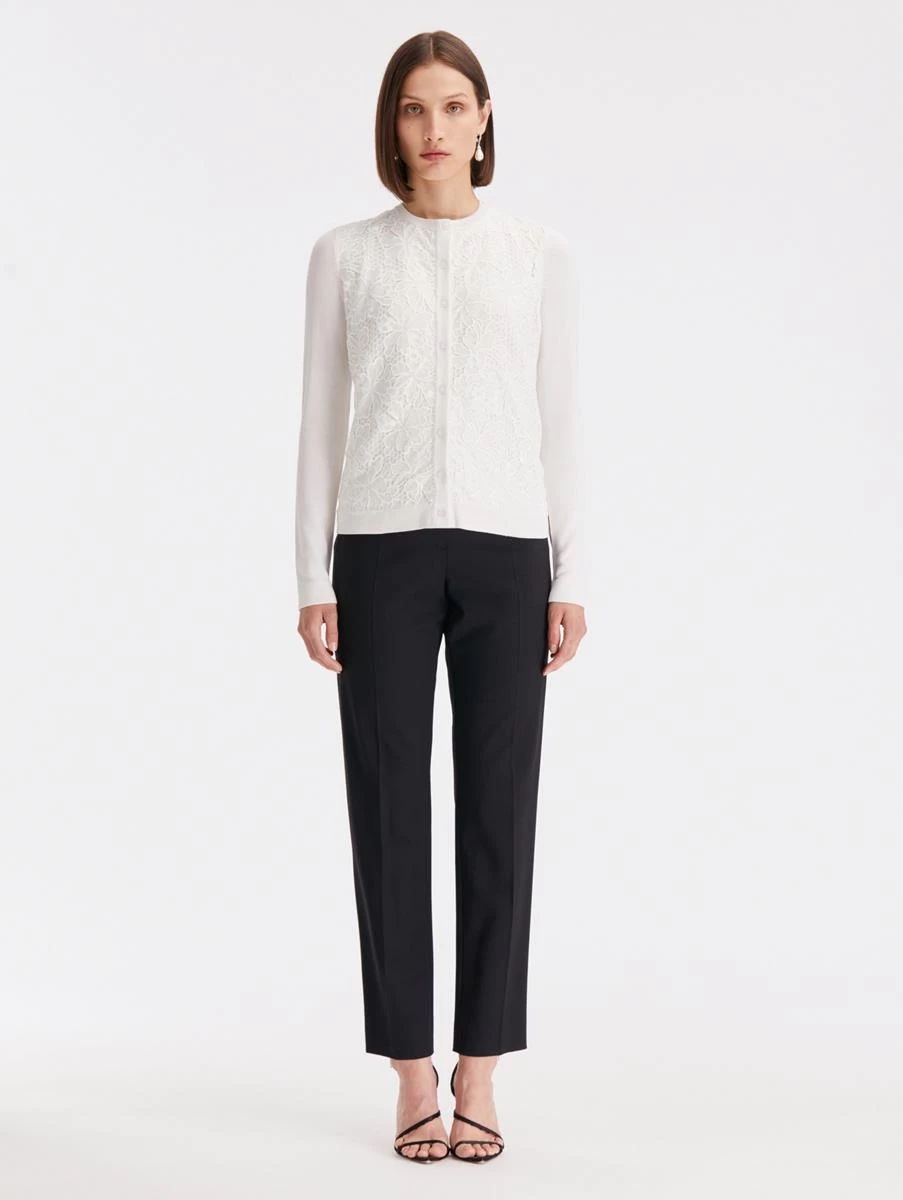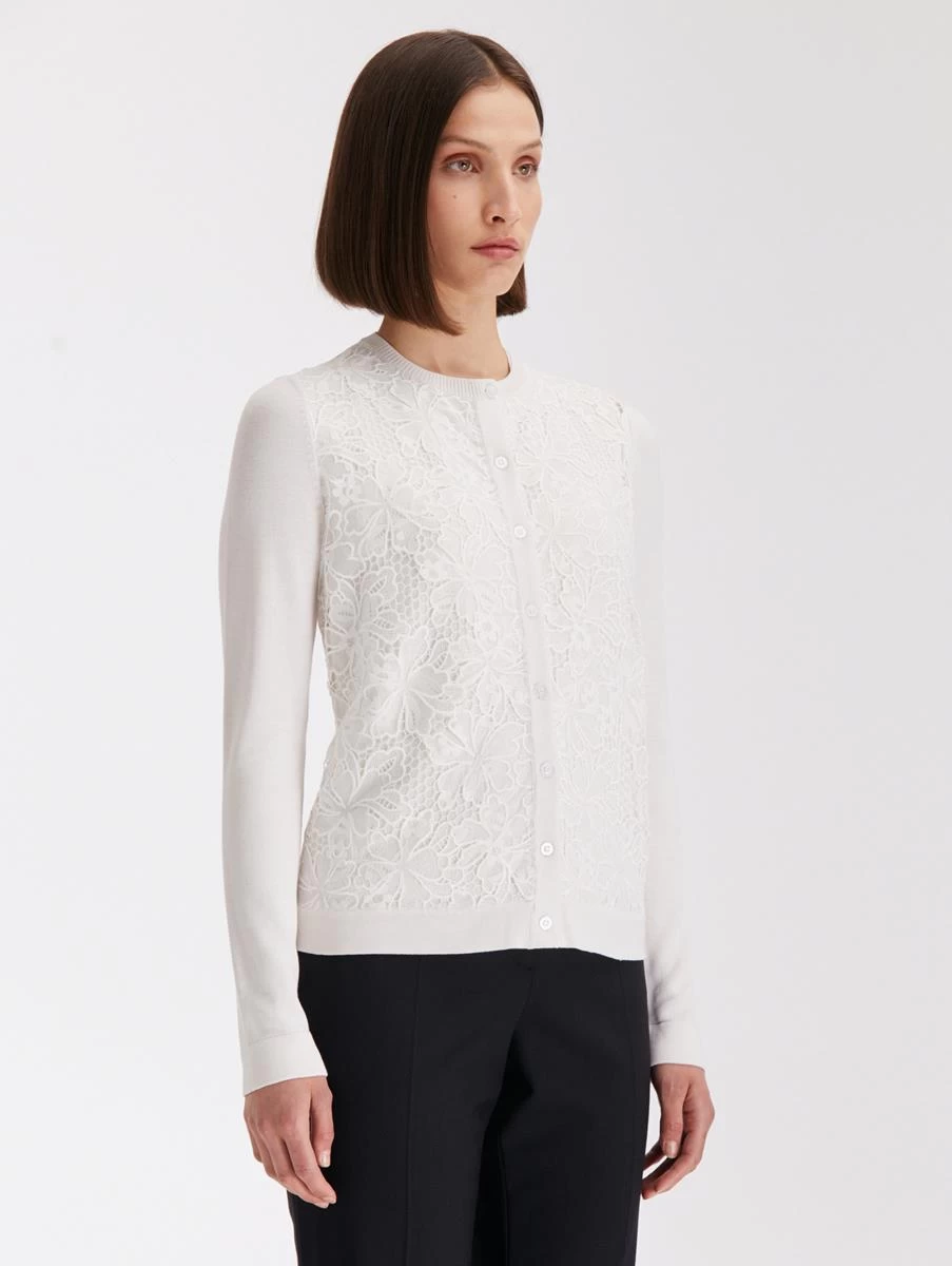 Crafted of bright white wool, this cardigan is knit with lined Chantilly guipure lace panels. This classic knit is the perfect pairing for color-complementary separates or is coordinating top.