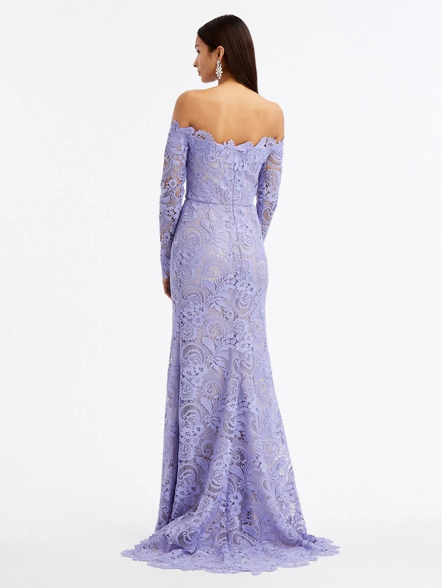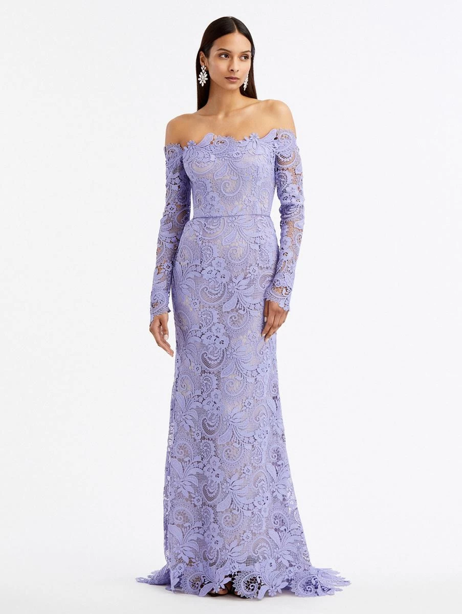 Stunning corded scroll guipure lace makes a modern statement in wisteria. Form-fitting at the sleeves and bodice, this gown flairs to sweep the floor. Wear it to your next event; it’s an exquisite garment that demands attention.