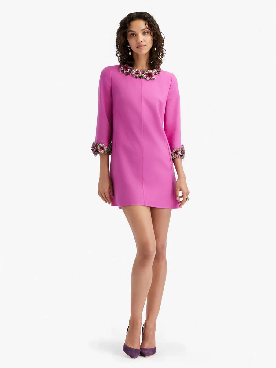 This minidress is elegantly elevated by crystal dahlia embroidery at the neckline and sleeves. This piece boasts a classic shift silhouette in complement to 3/4 length sleeves.
