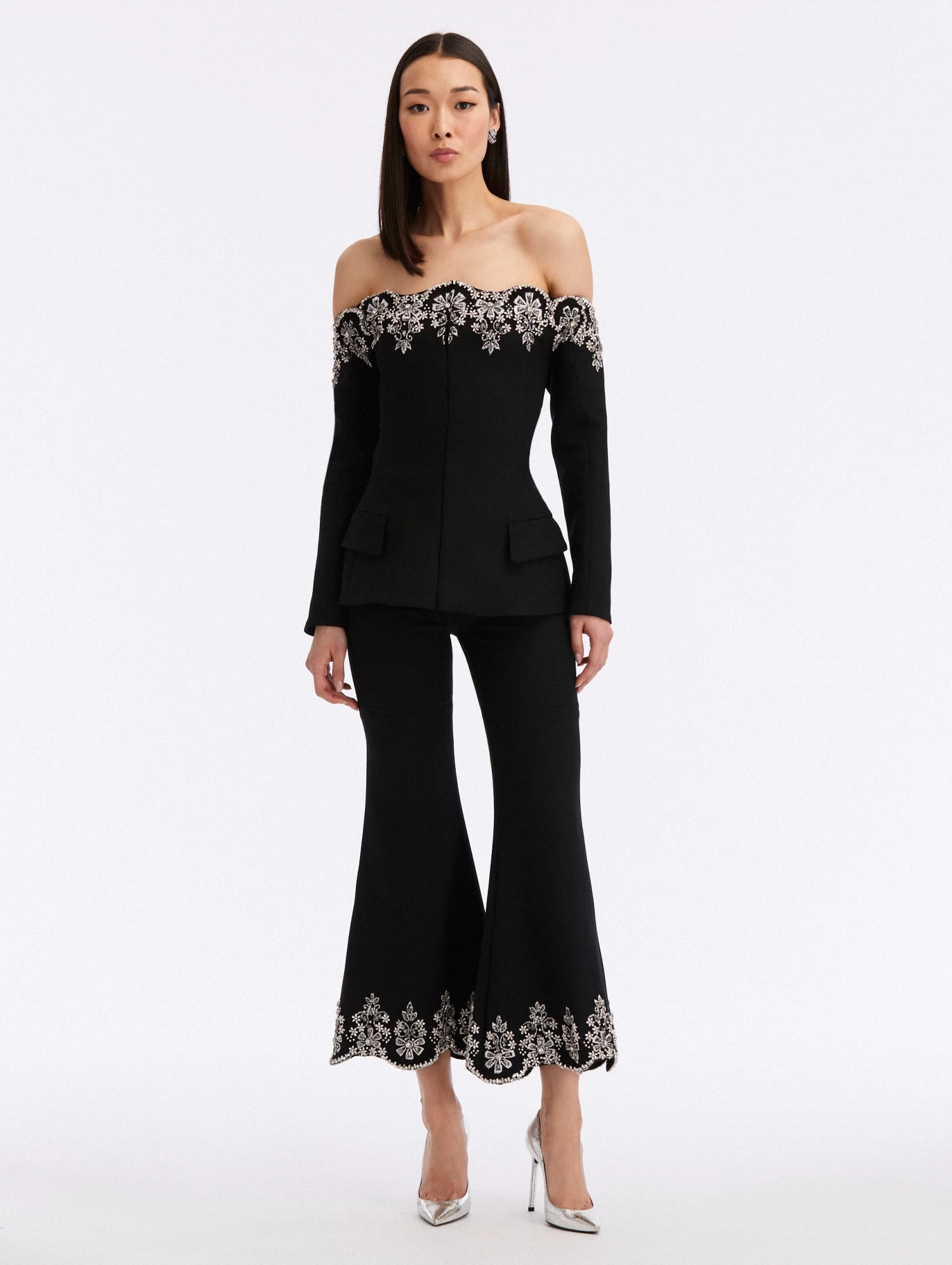 Separates are the modern answer for dynamic evening dressing. A stunning season favorite, this statement jacket features an off-the-shoulder neckline and crystal scallop embroidery.
