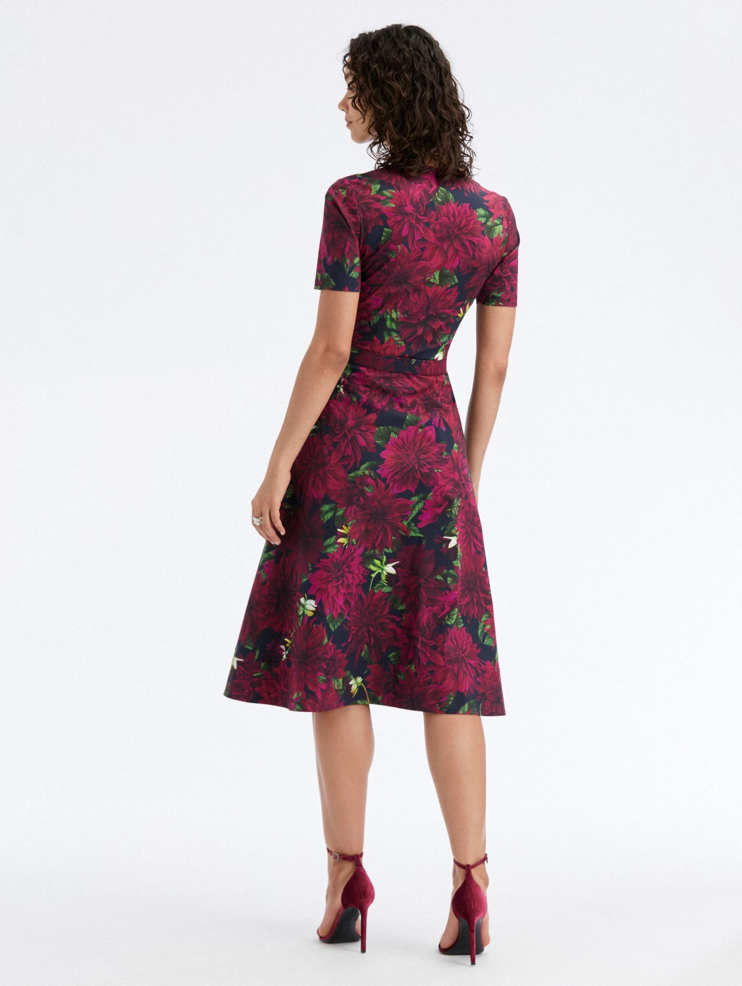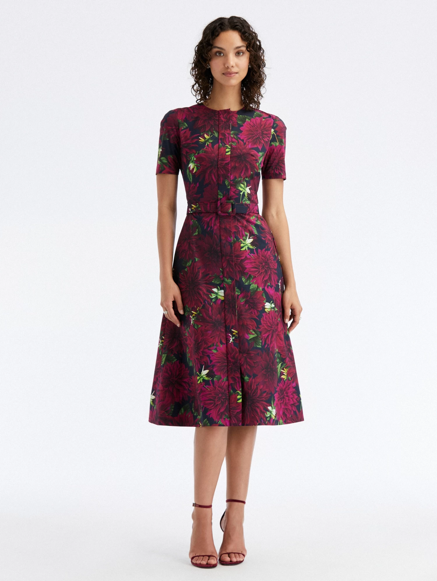 A favorite silhouette season after season, this midi dress has been updated with this season’s dahlia motif. Cut from lightweight cotton poplin, this style is complete with a coordinating buckle belt and a concealed button front.