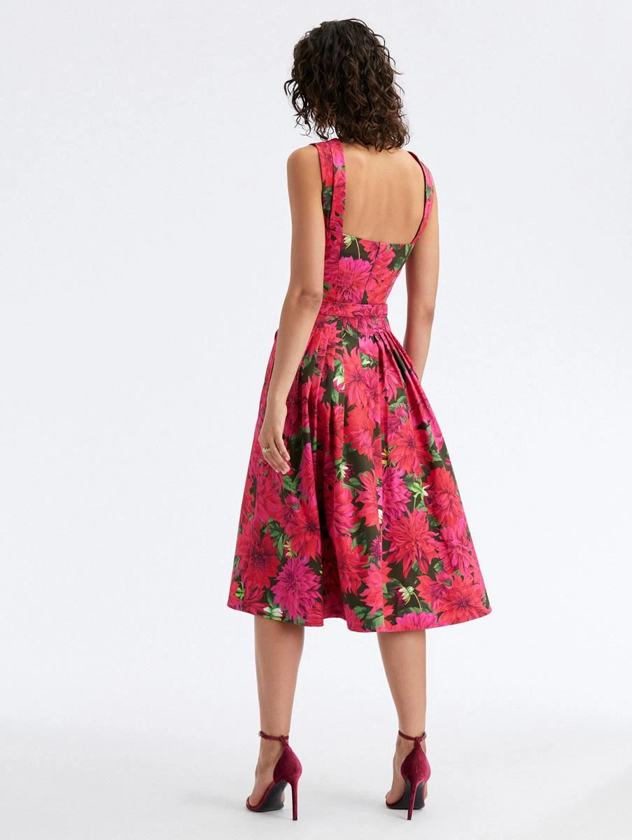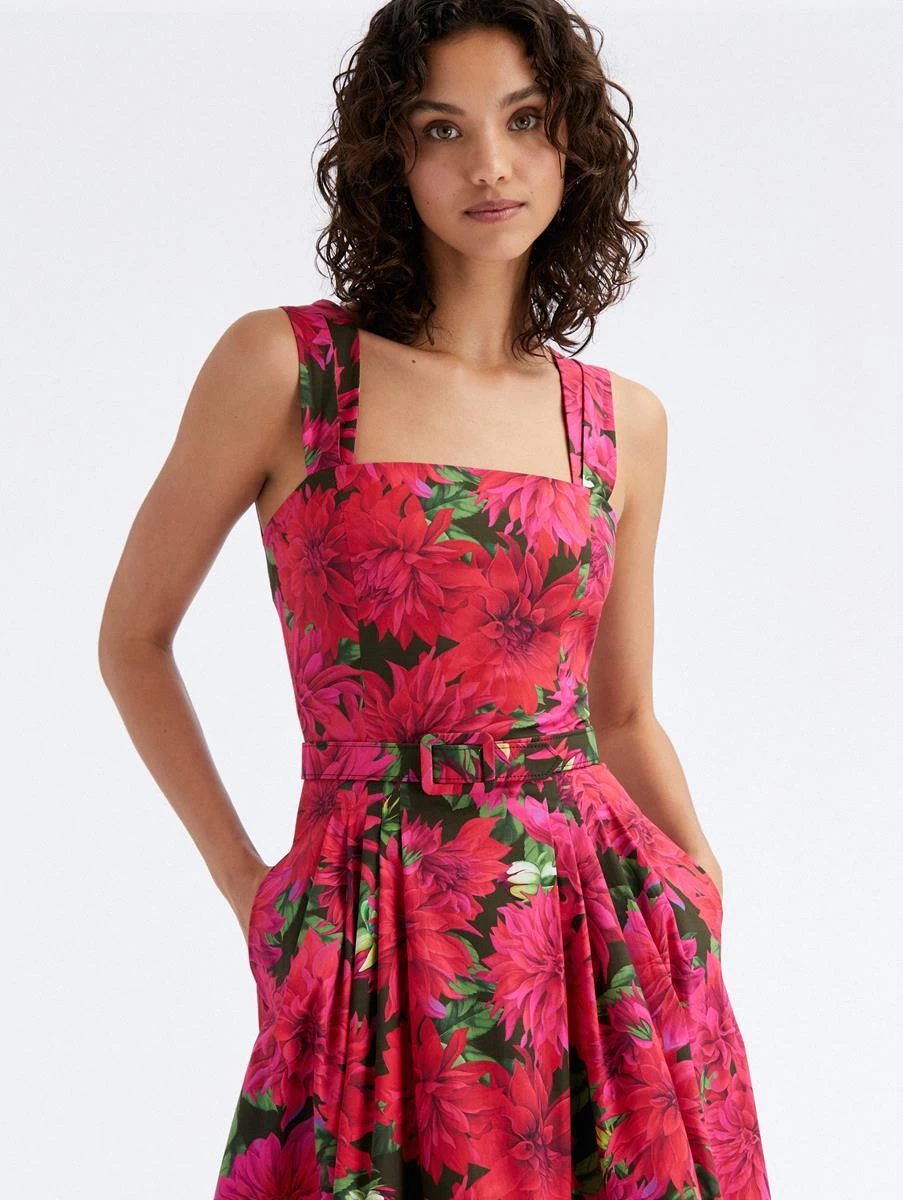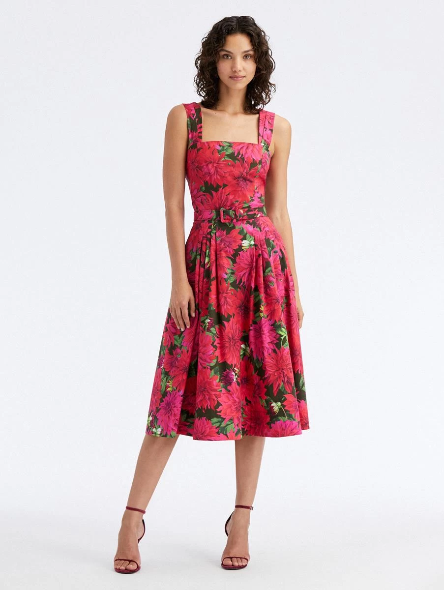 Signature cotton poplin brings the bright dahlia print of the Pre-Fall collection to life. This daytime midi is crafted with a square neckline and is finished with a coordinating buckle belt.