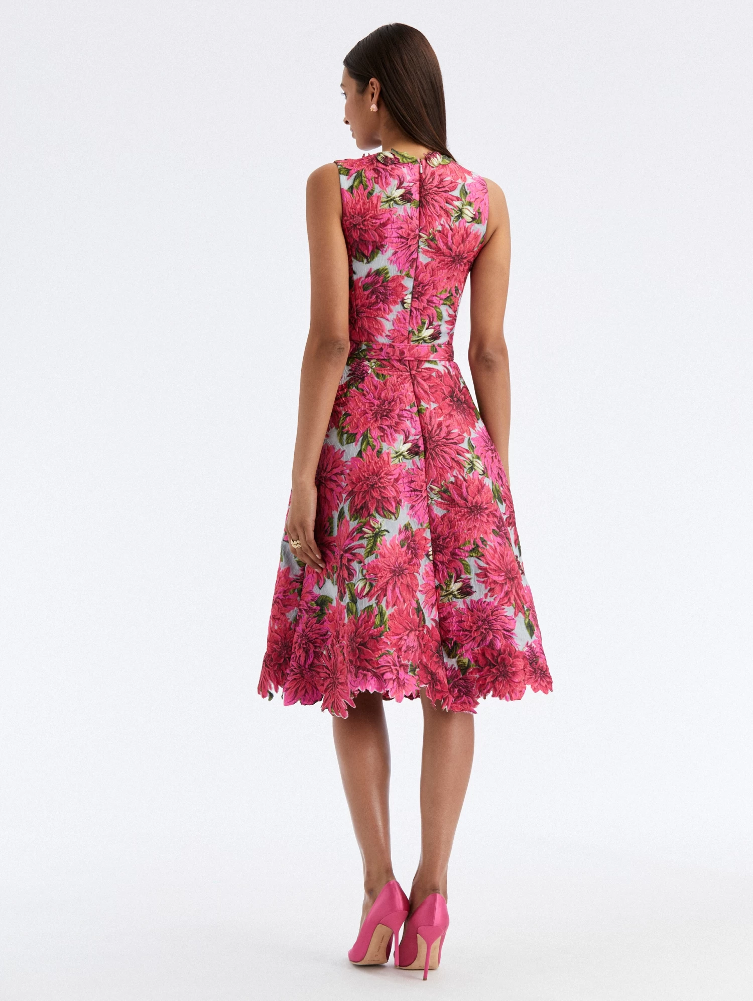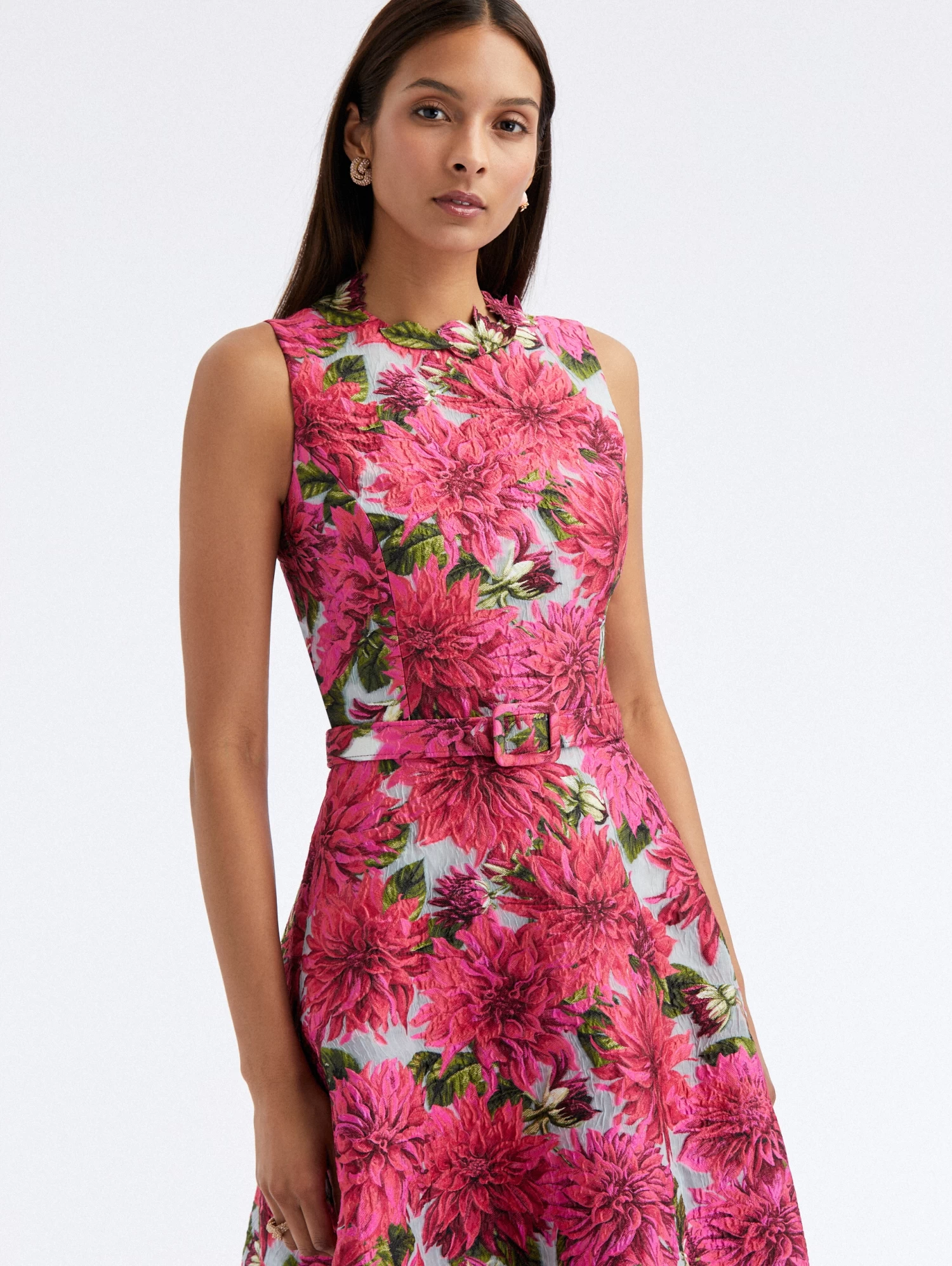 A house-favorite is reimagined season after season. Decorated with exquisite dahlia embroidery, this midi dress is cut in decadent fil coupé silk and features a coordinating buckle belt.