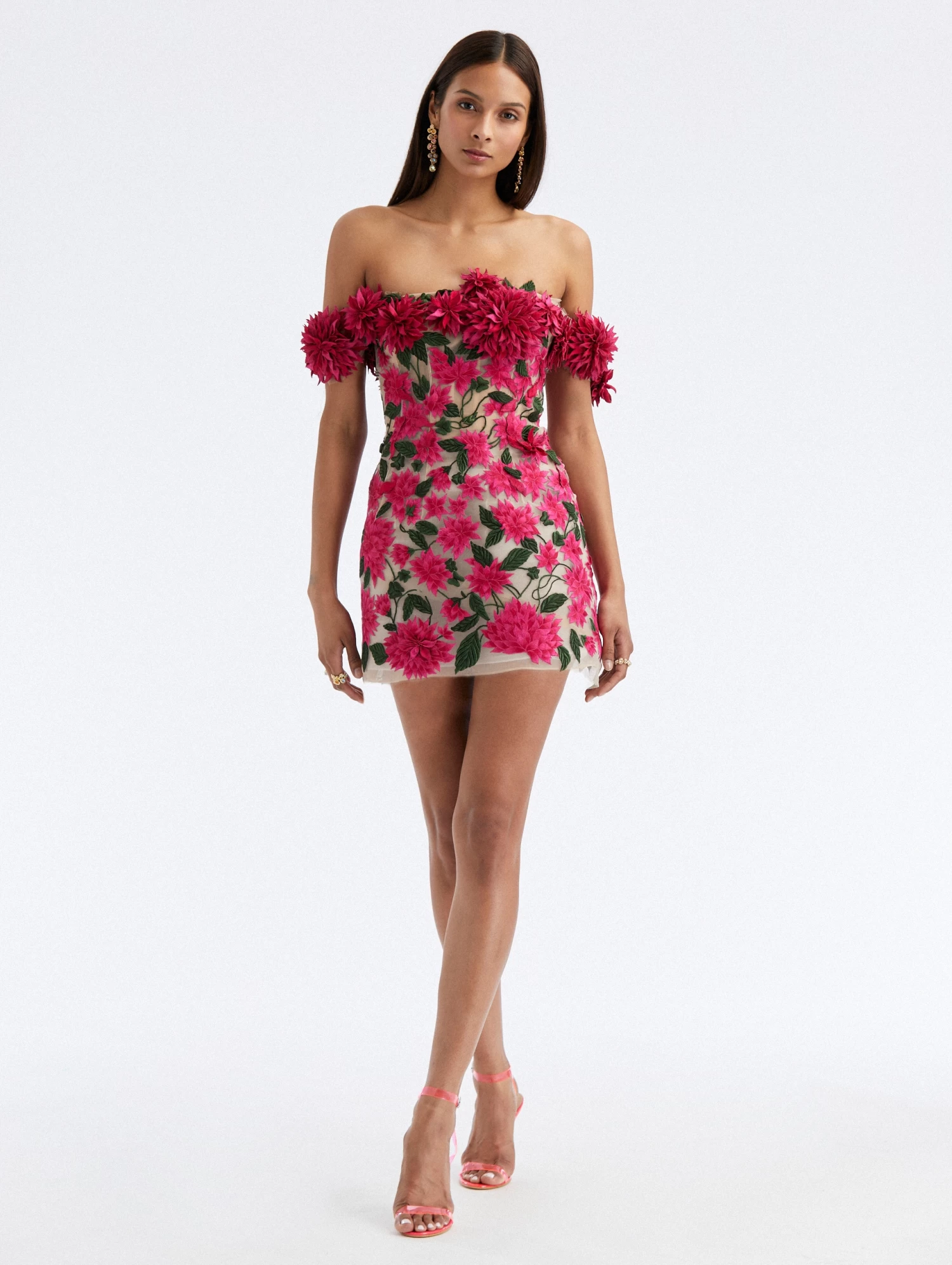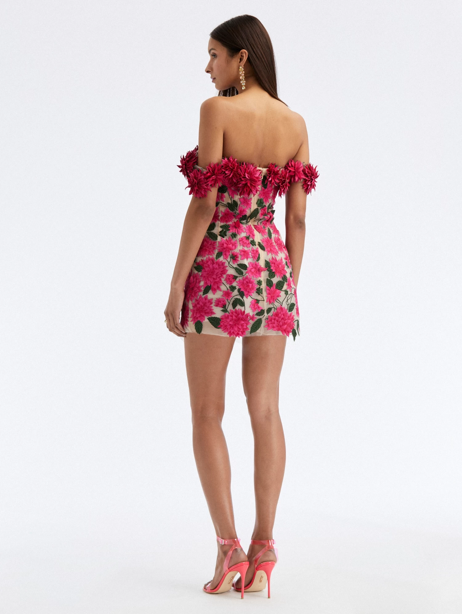 A romantic option for upcoming occasions, this cocktail mini is crafted from delicate tulle and features dahlia threadwork embroidery with silk appliques at the off-the-shoulder neckline.
