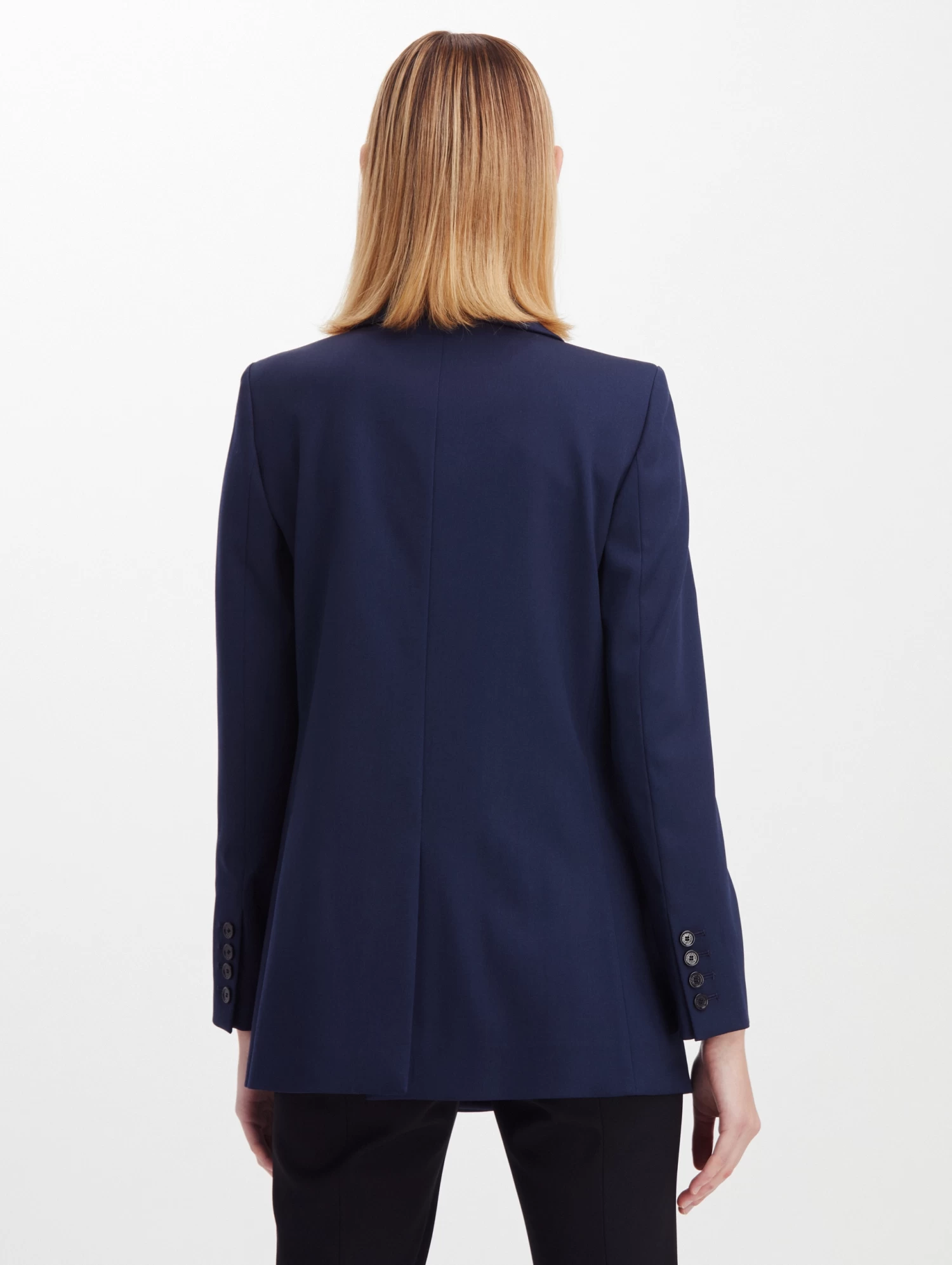 Expertly tailored in Italy, this double breasted jacket is cut from navy stretch-wool and is finished with pockets and smooth crepe de chine lining. Layer with anything from pencil dresses to tees and denim.