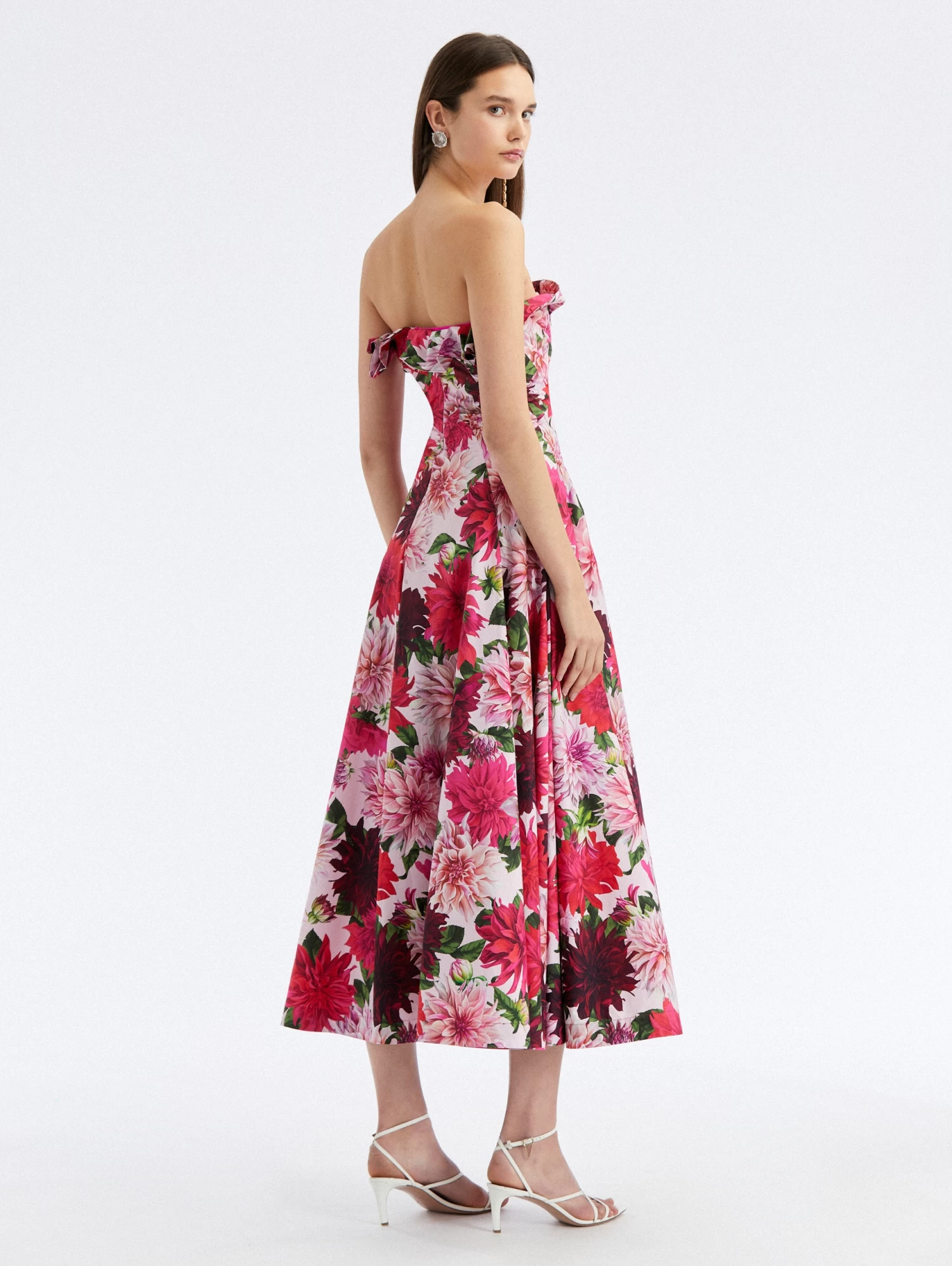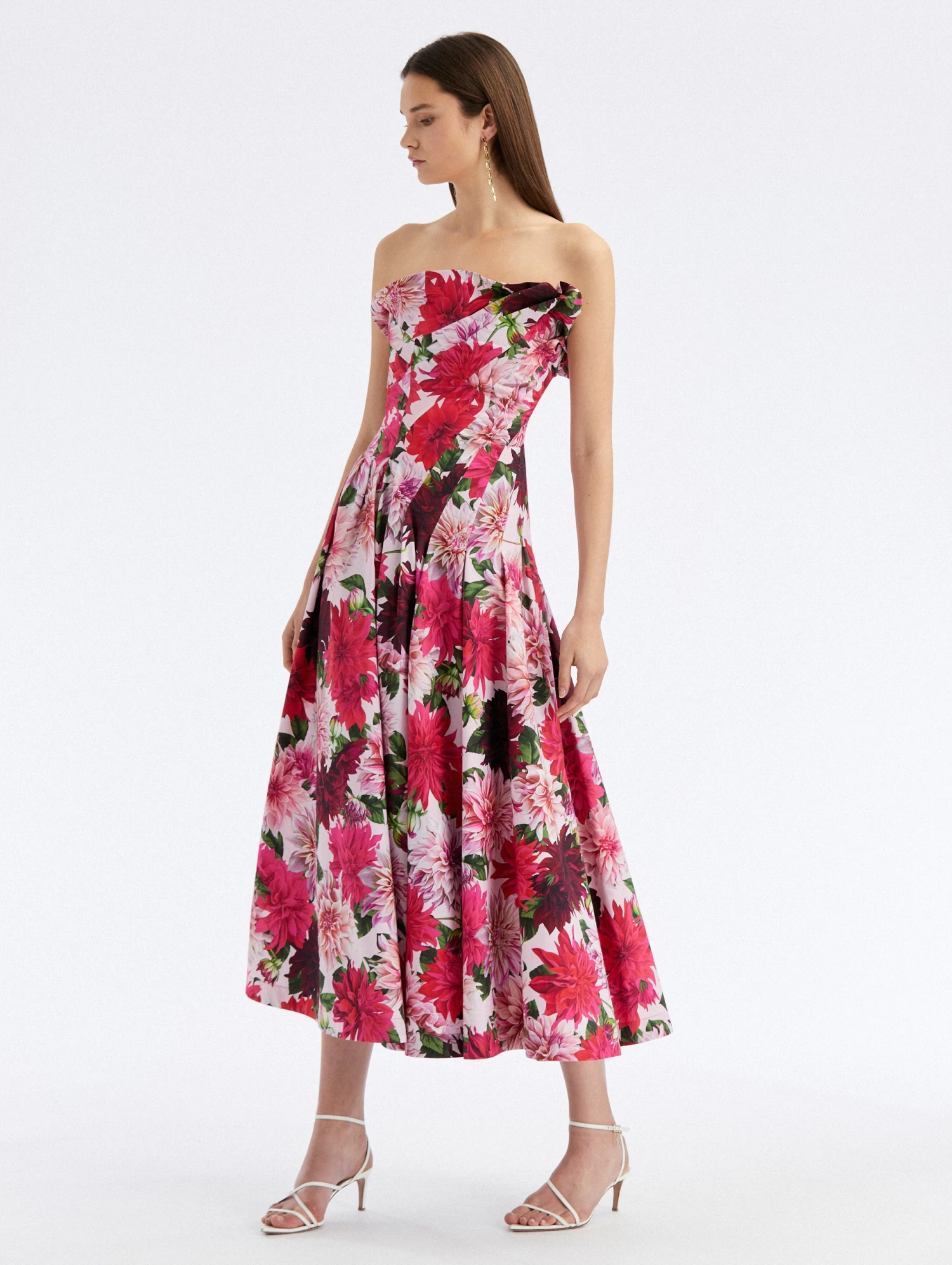 Defined by a draped neckline, this strapless midi dress is crafted from crisp cotton poplin in a timeless fit-and-flare silhouette.