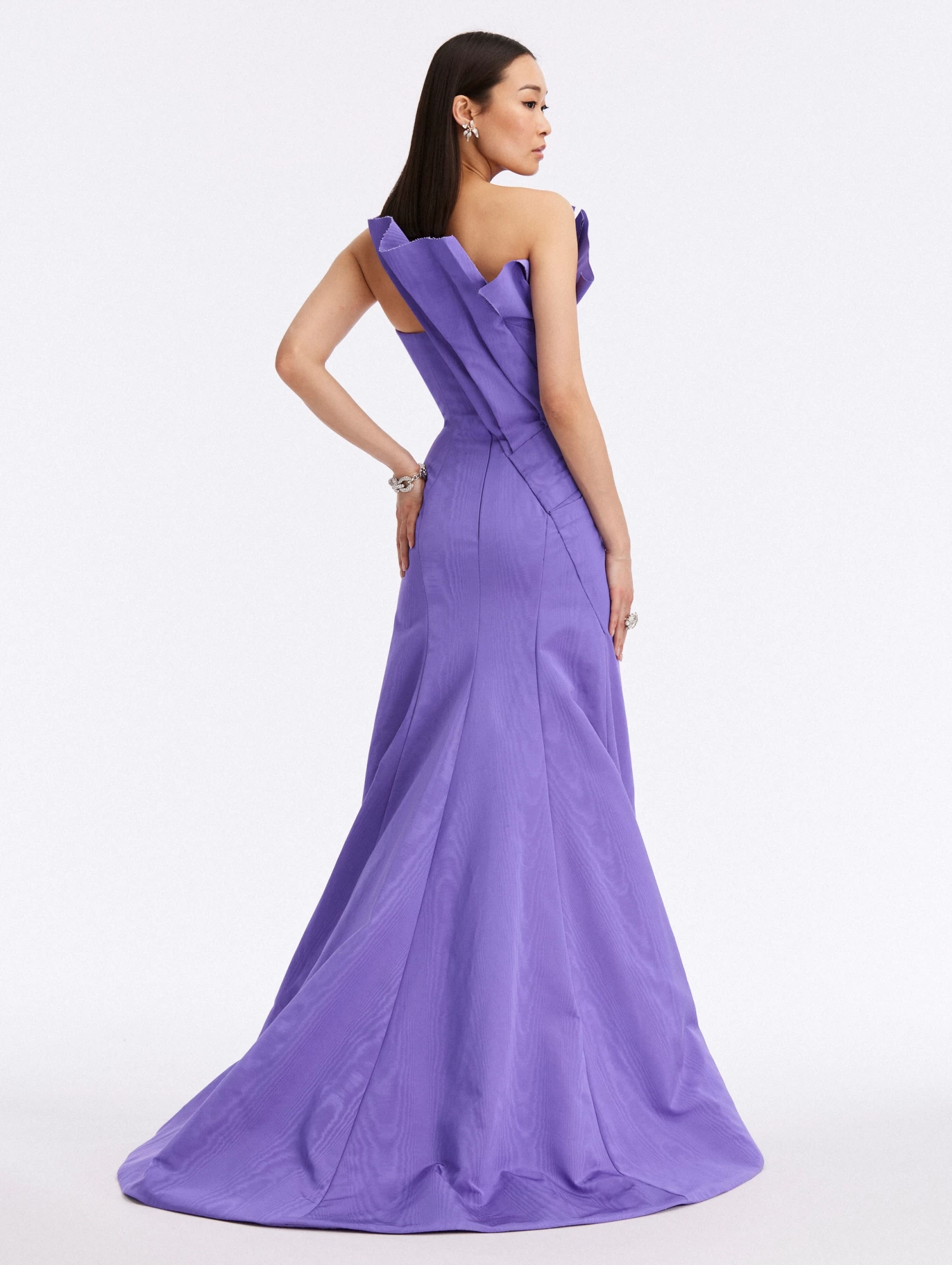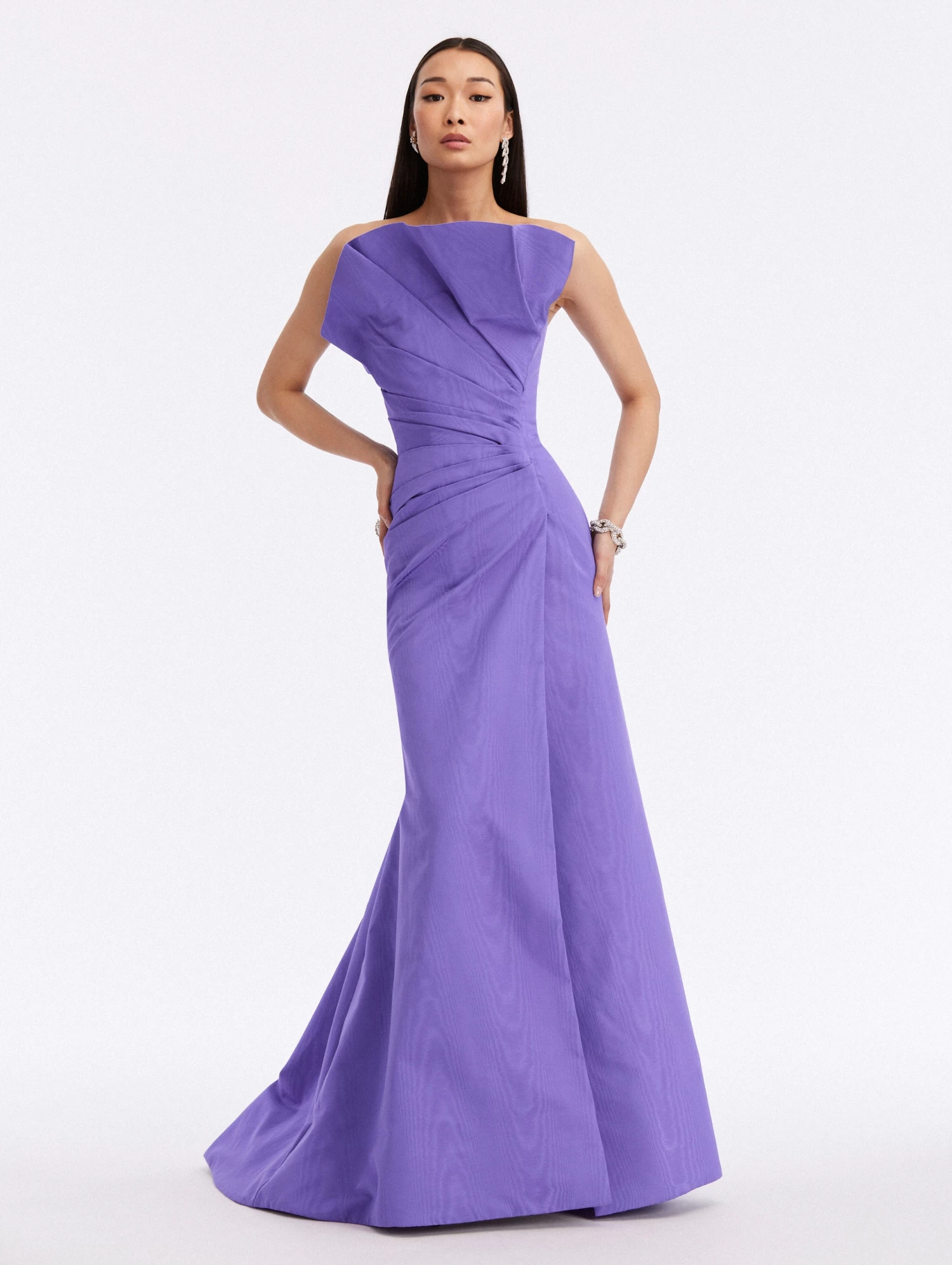 A standout from the new collection, this trumpet gown is crafted from iris colored moire faille. A strapless, fanned neckline and fitted bodice exhibit the timeless femininity that has been inherent to the house since its beginning.
