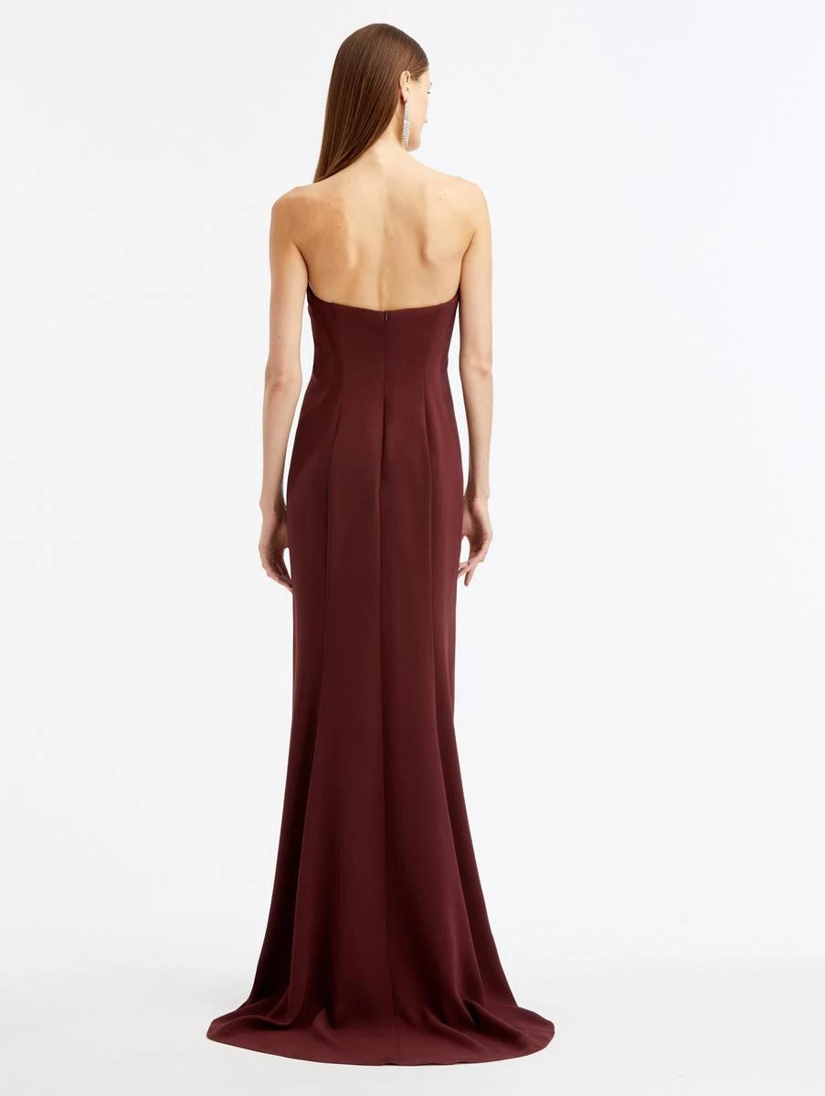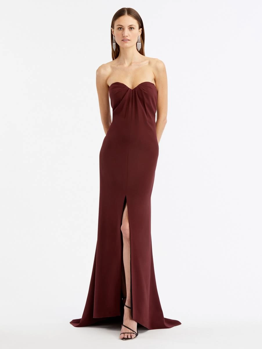 The epitome of timeless glamour, this gown is cut from smooth silk. A thoughtfully draped bodice and leg-baring front slit define this timeless piece.
