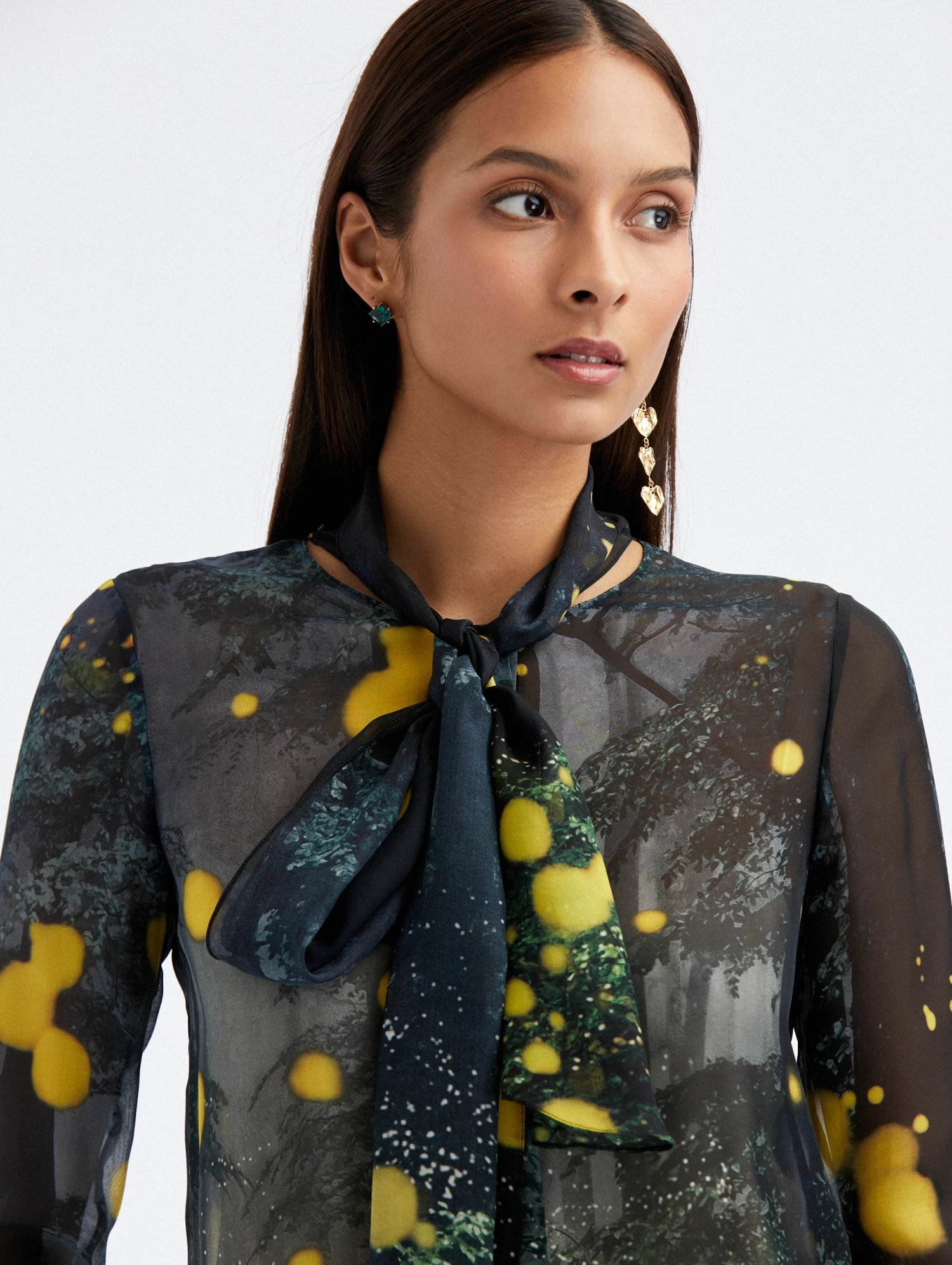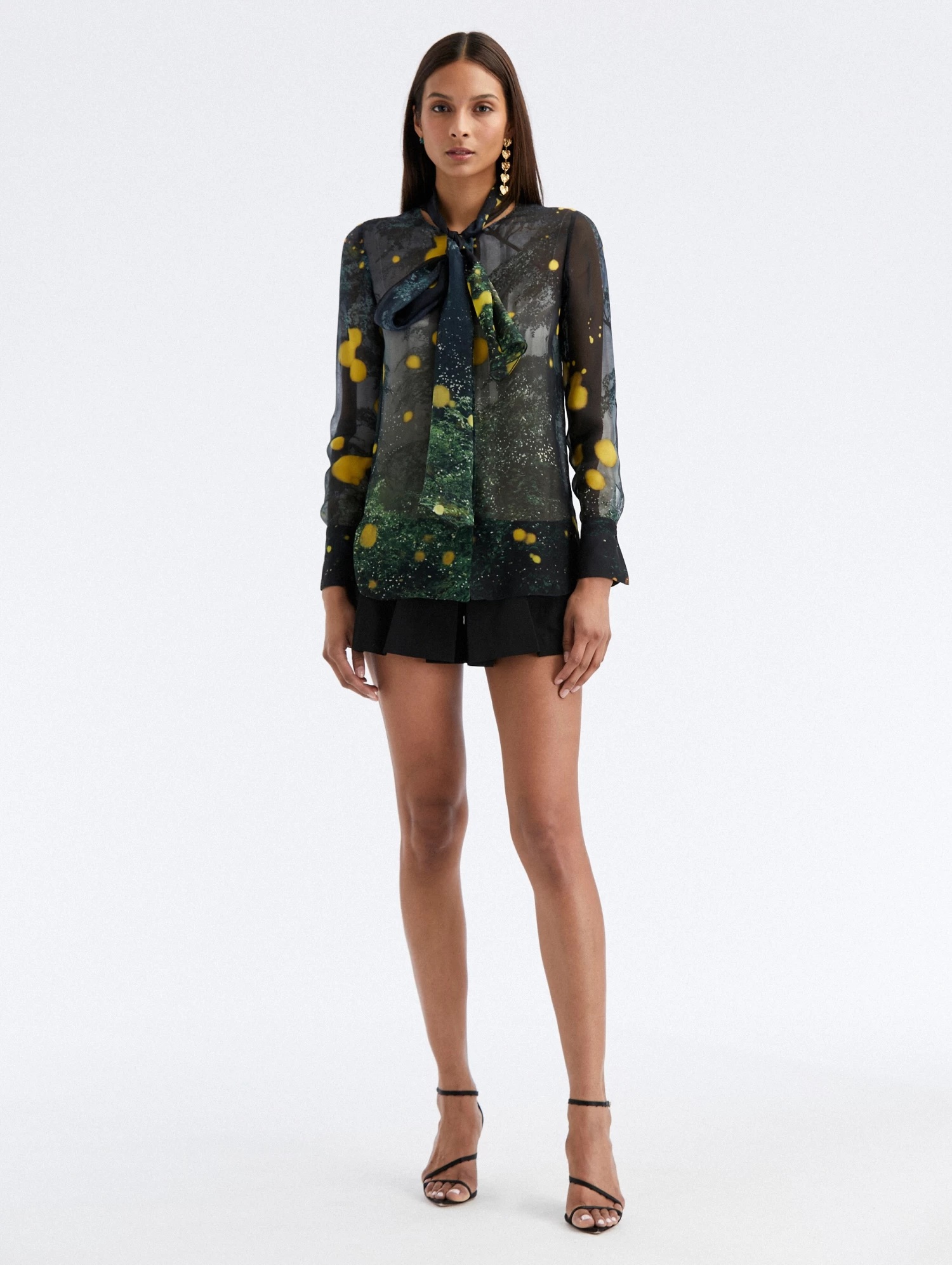 This tie-neck blouse is defined by the luminescent firefly motif, a pillar of the Pre-Fall 2023 Collection. Cut of silk chiffon, this romantic blouse boasts a lighter-than-air construction.