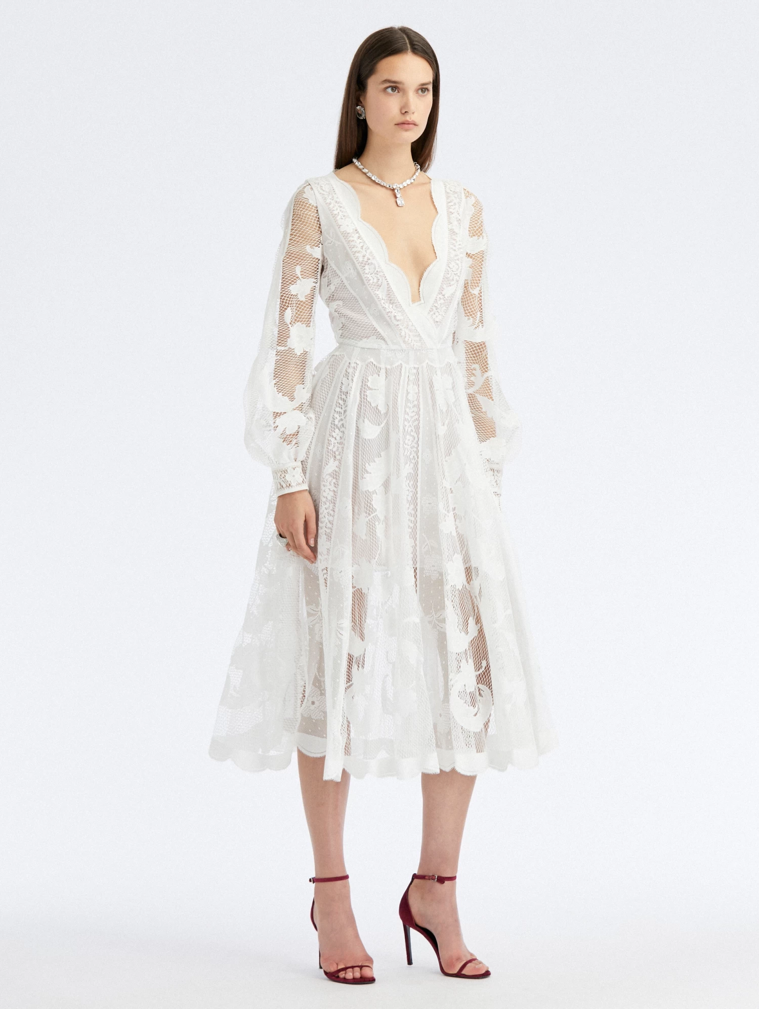Cut of fine floral guipure lace, this midi skirt boasts a semi sheer construction with a v-neckline and scalloped hemline – exuding the timeless elegance with feminine flair for which Oscar de la Renta is known.