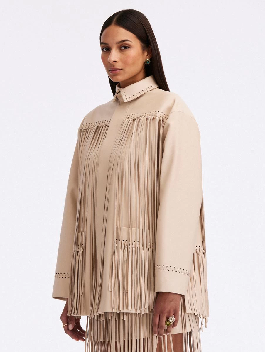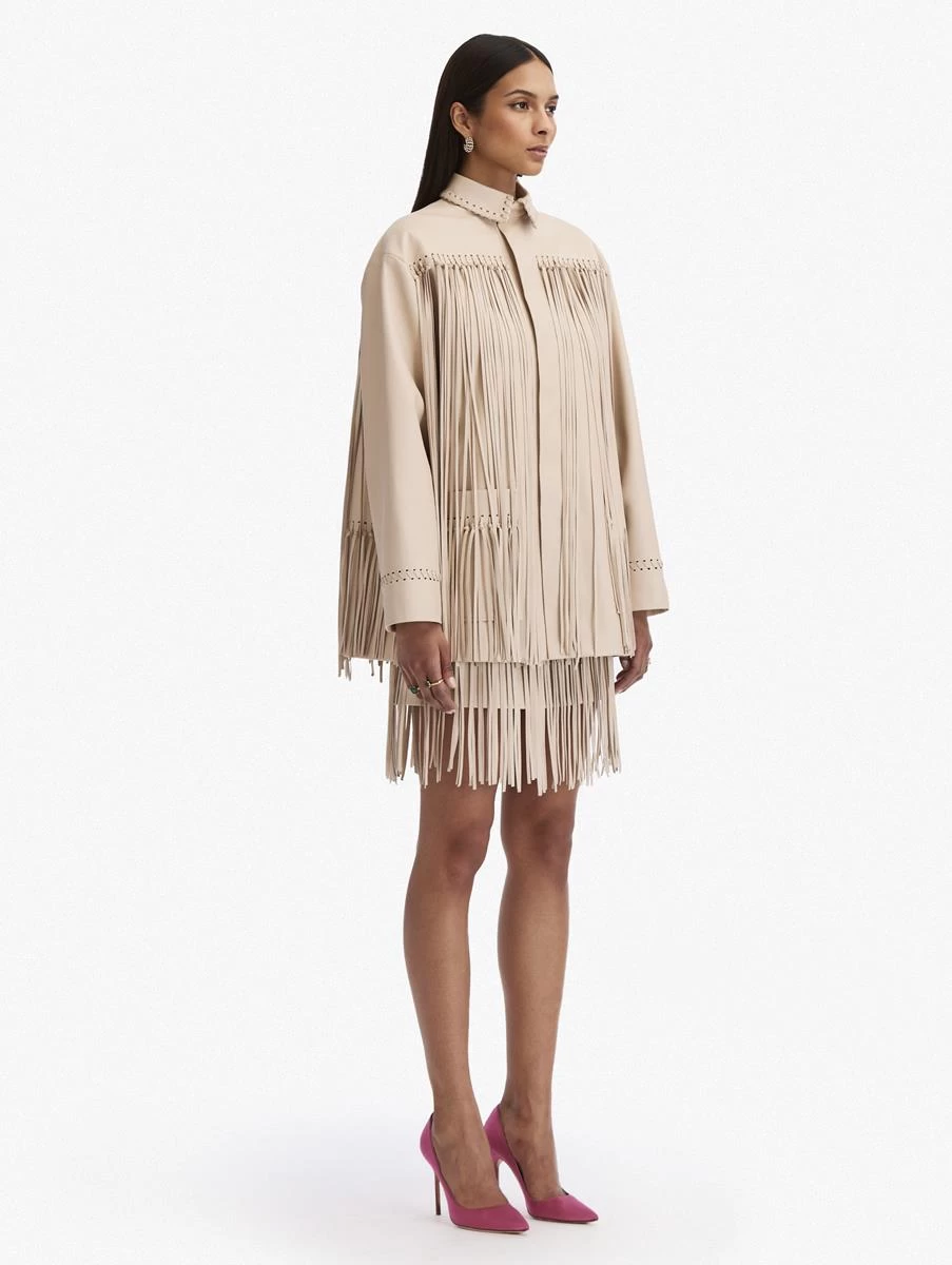 Cut from supple bone-hued leather in a boxy oversized silhouette, this statement jacket is framed with swaying fringe. Pair with its complementing skirt for a memorable moment.