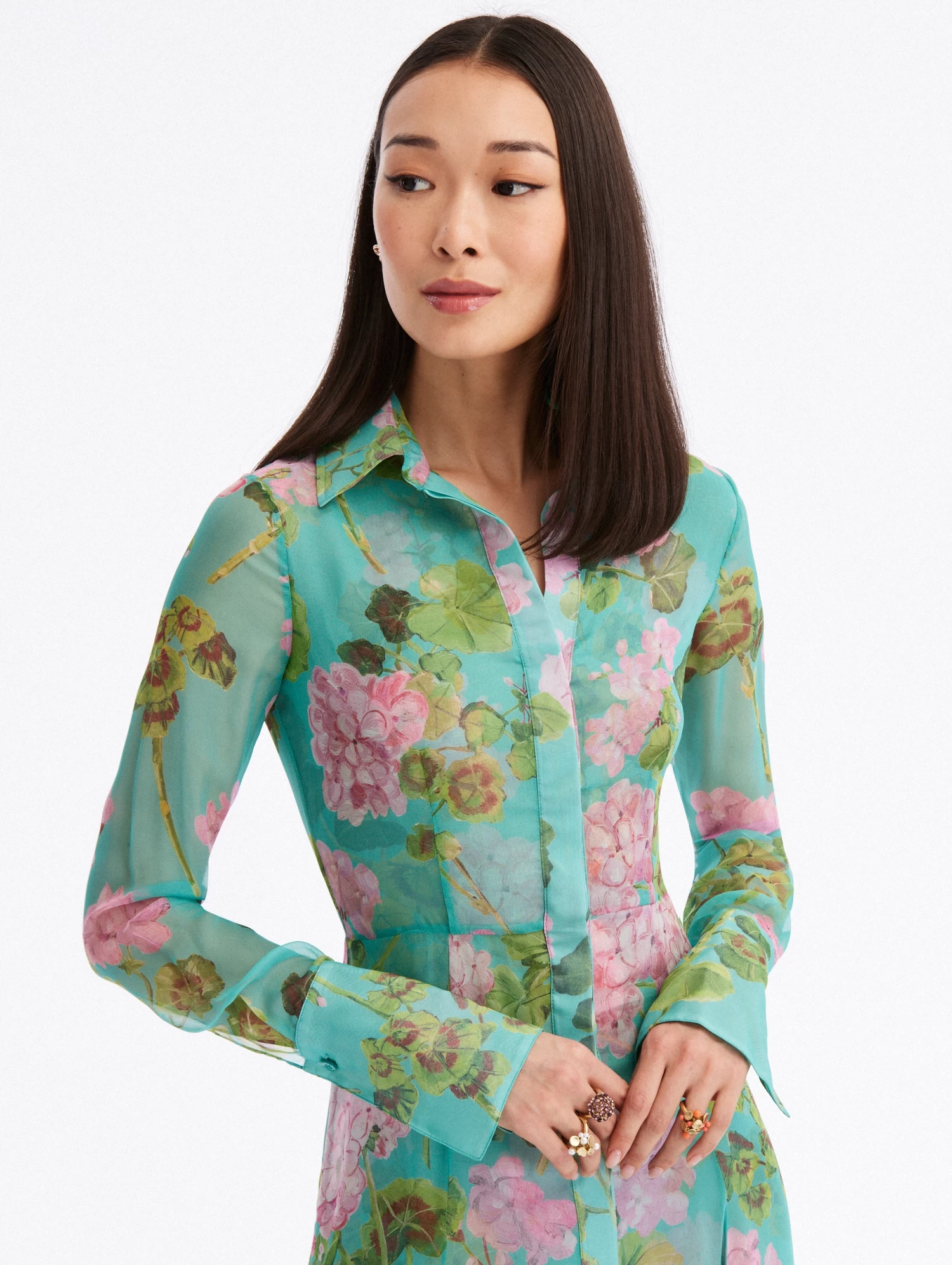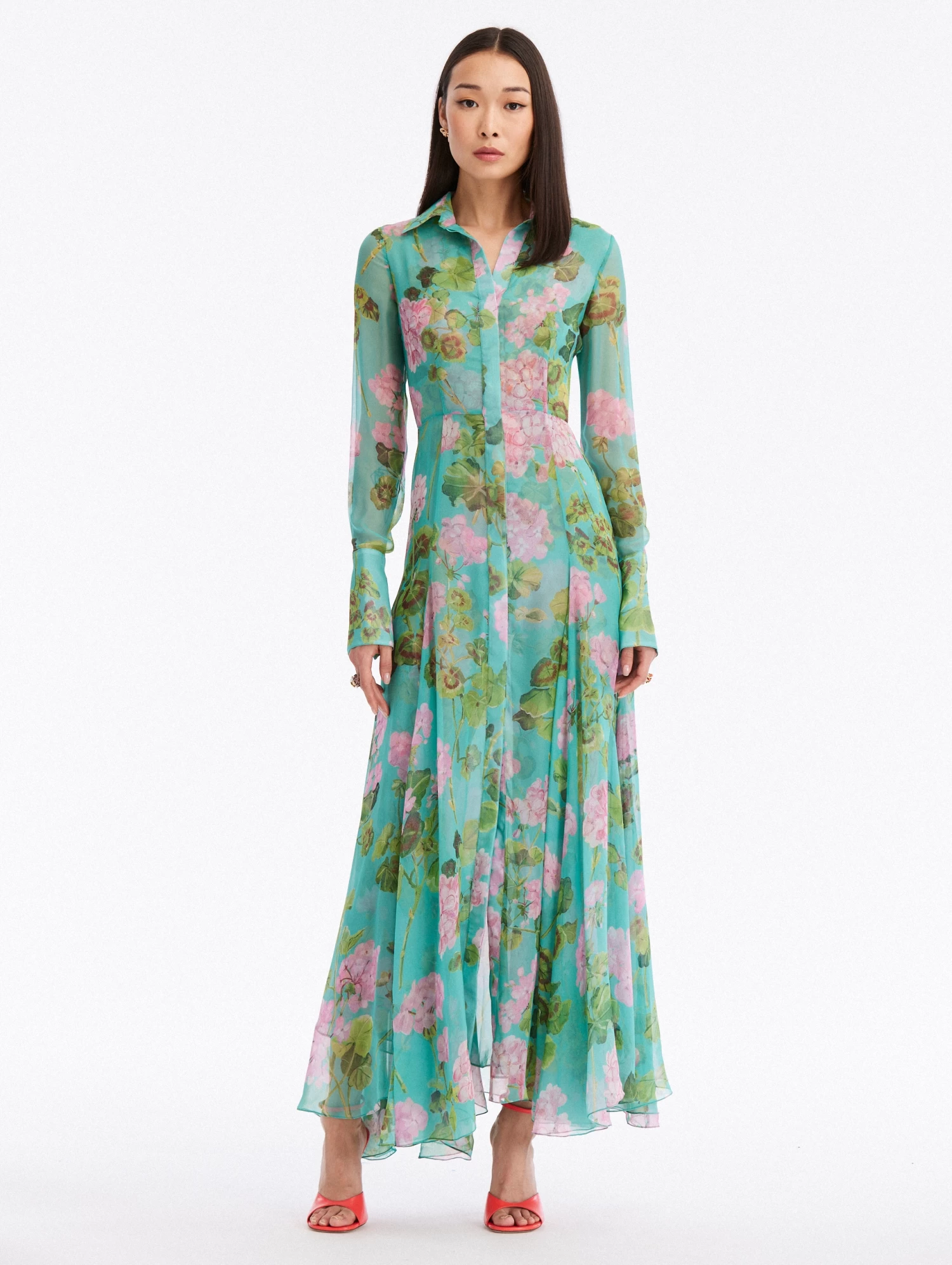 Perfectly suited for any occasion, this long sleeve maxi dress is cut from silk chiffon and boasts a shirt collar and concealed button front.