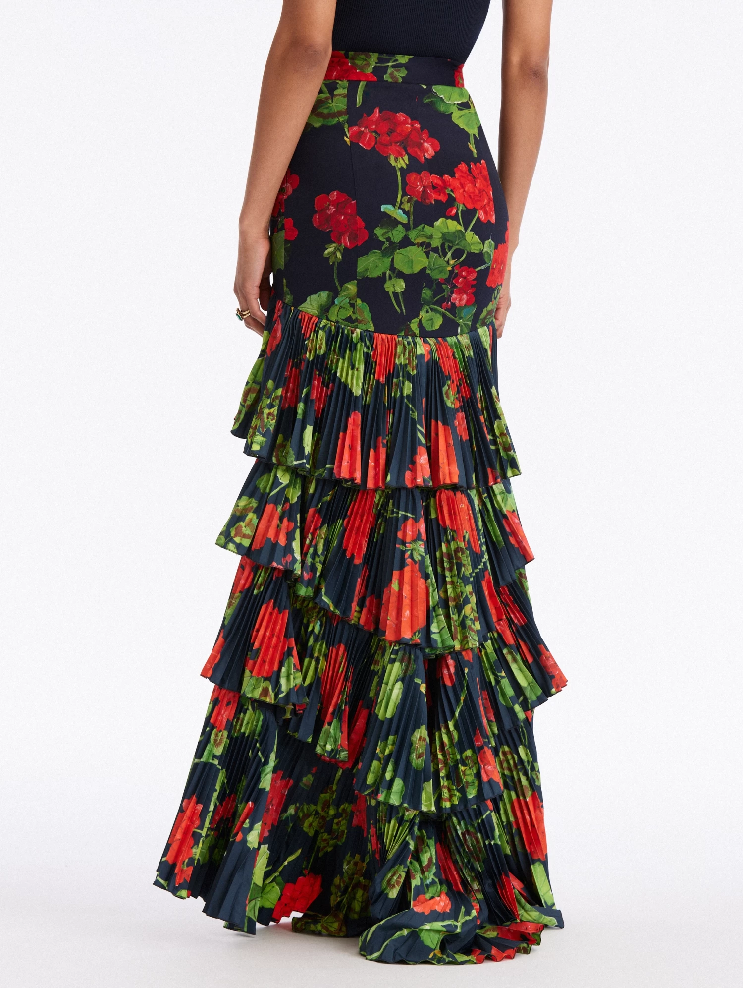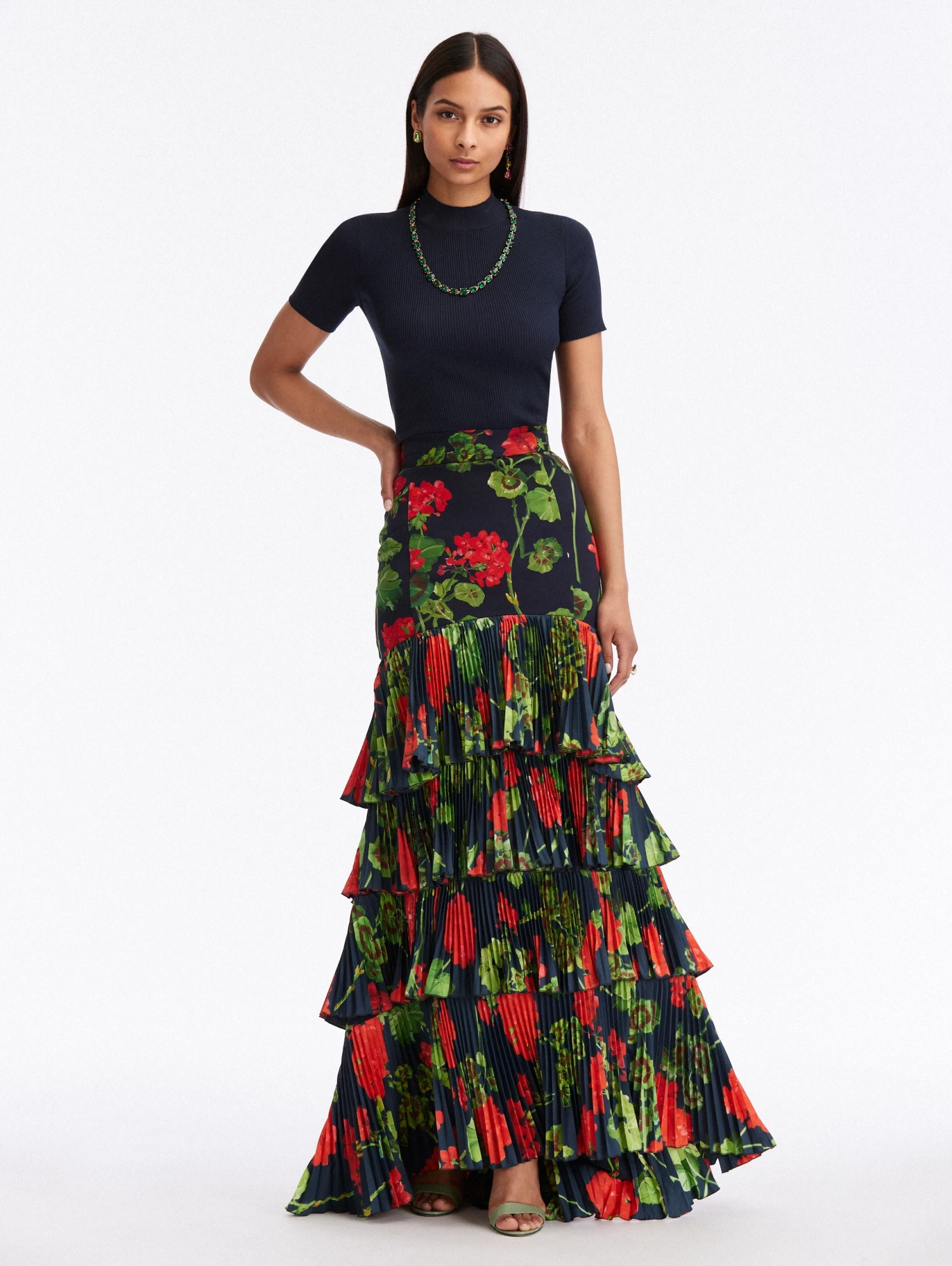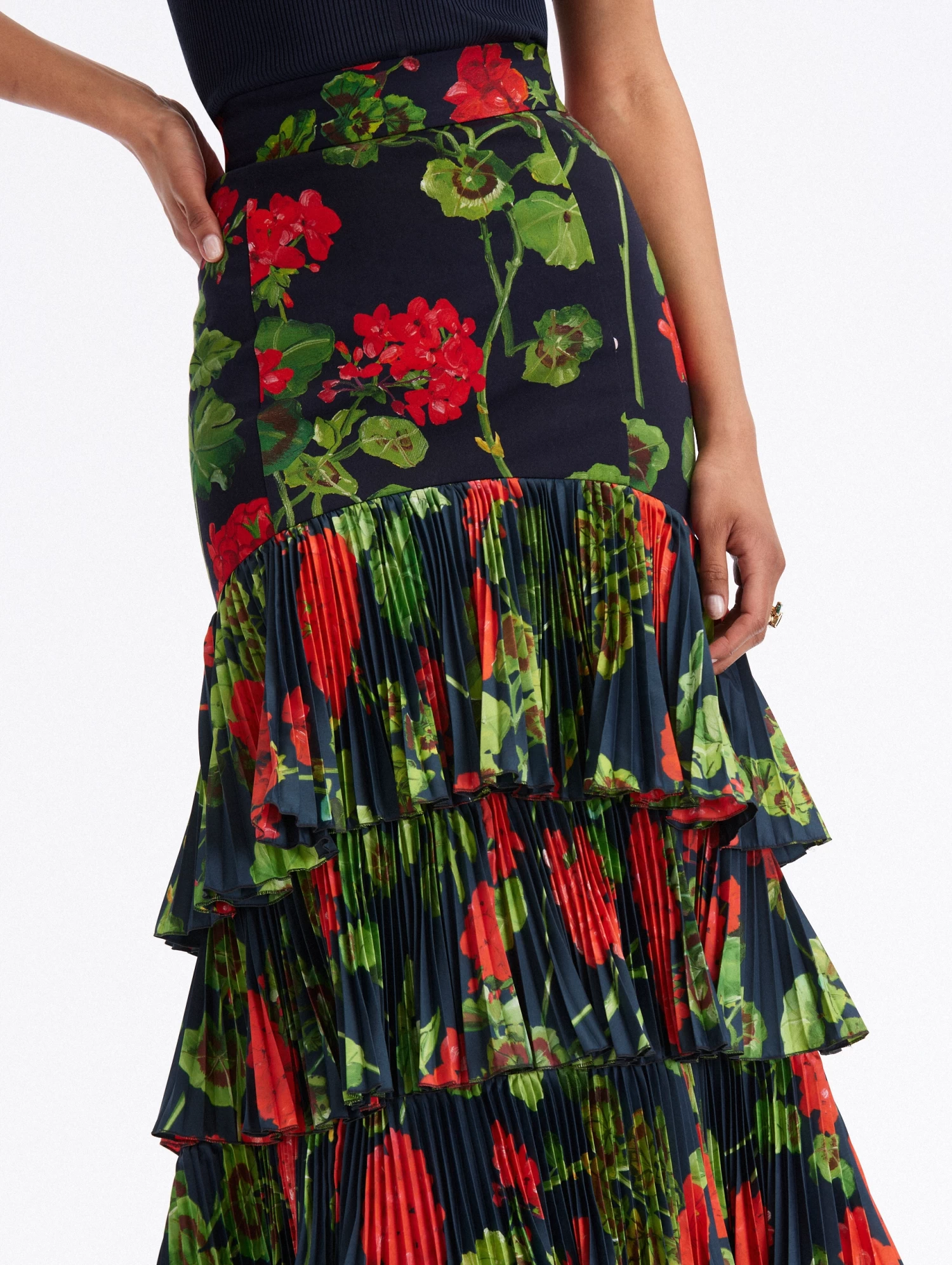 Cut from crisp cotton, this full-length skirt is decorated with this season’s morning glory print in rich shades of red and navy. Finished with tiered pleated ruffles, this is sure to be a forever favorite.