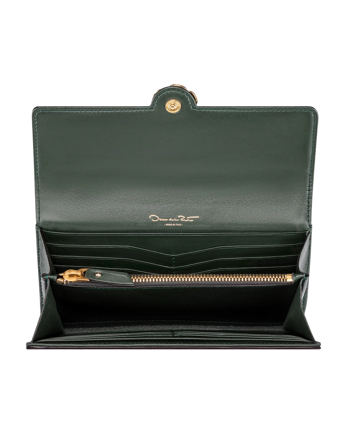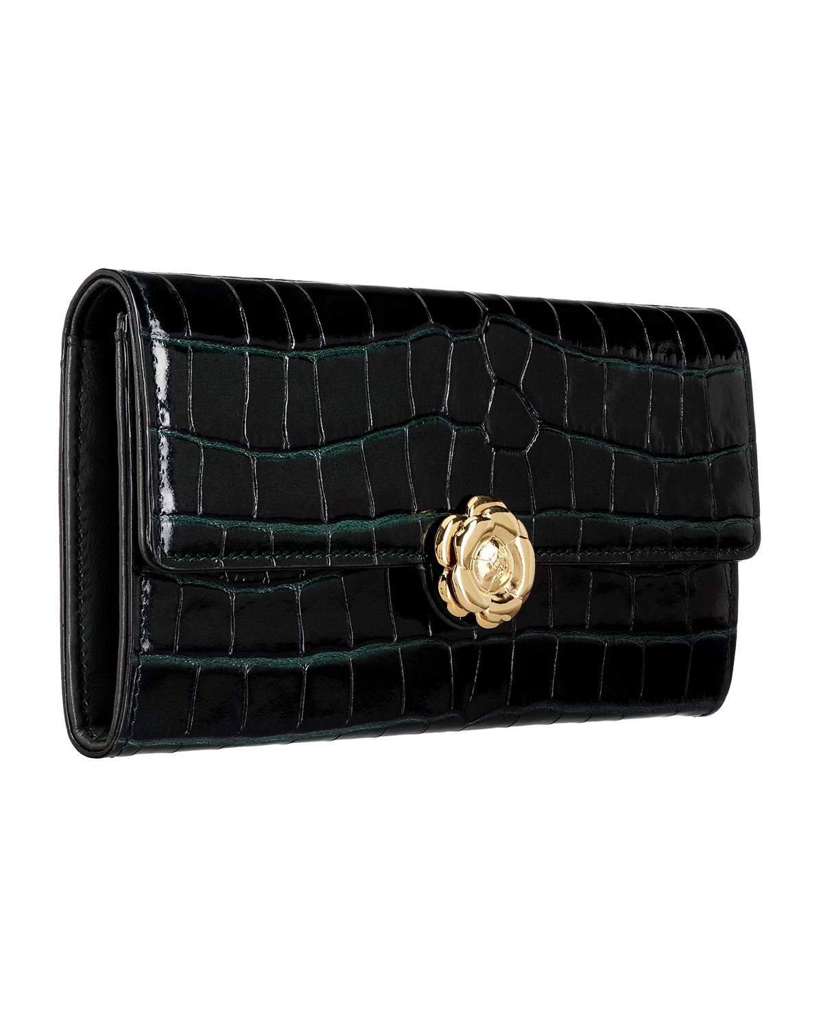 A continental wallet is an everyday essential. This classic style is crafted from green croc-embossed leather with a gunmetal gardenia at the clasp. Its divided interior has copious compartments to make it effortless to stay organized.