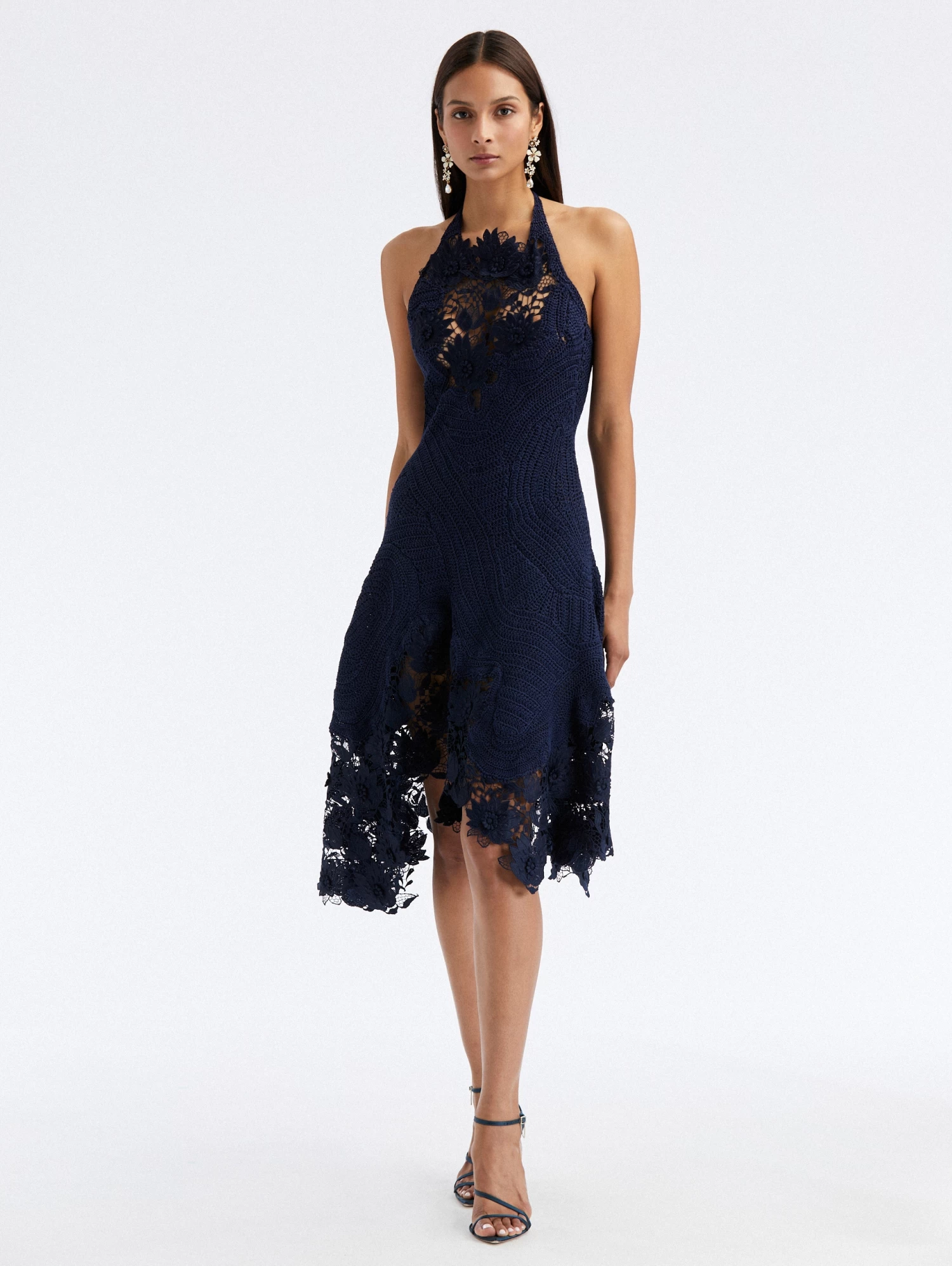 Hand crocheted in soft cotton, this piece is designed with floral lace inset detailing. With a halter neckline and fitted silhouette, this dress boasts an elevated bohemian construction.