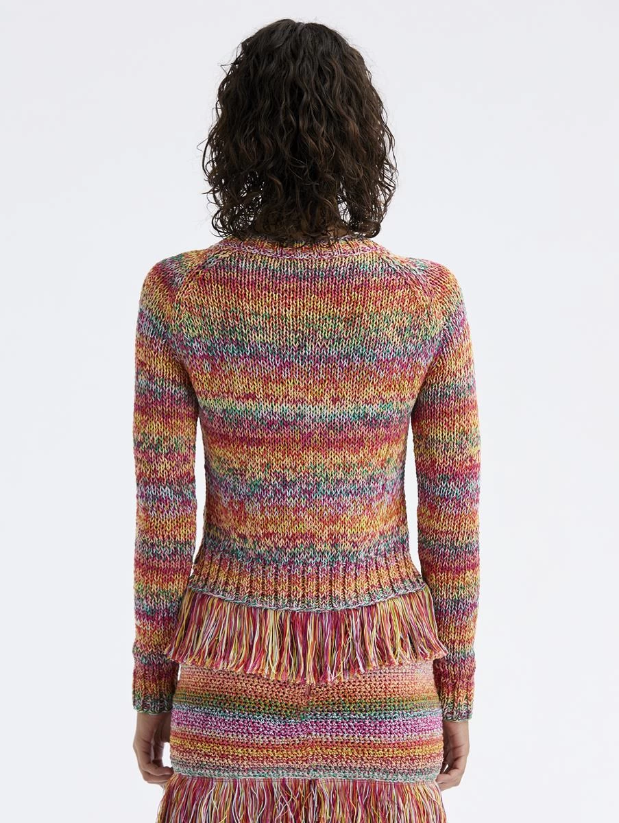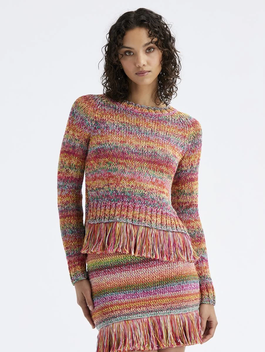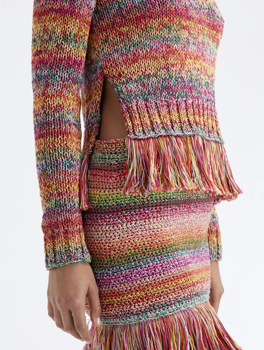 Defined by cascading multicolor stripes, this hand crocheted pullover boasts a statement fringed hemline. Pair with its coordinating skirt for an ensemble that reigns supremely feminine.