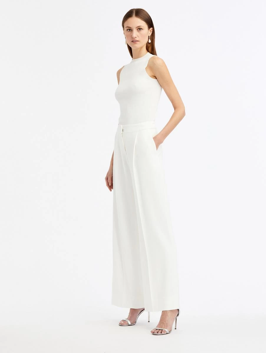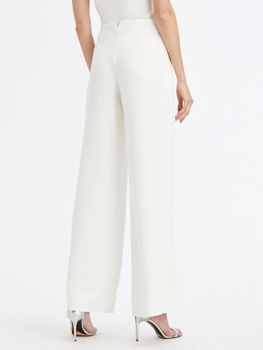 In bright ivory, the classic high waisted pant makes a modern return in a wide leg silhouette. Pair with color complementing separates for a elegant statement.