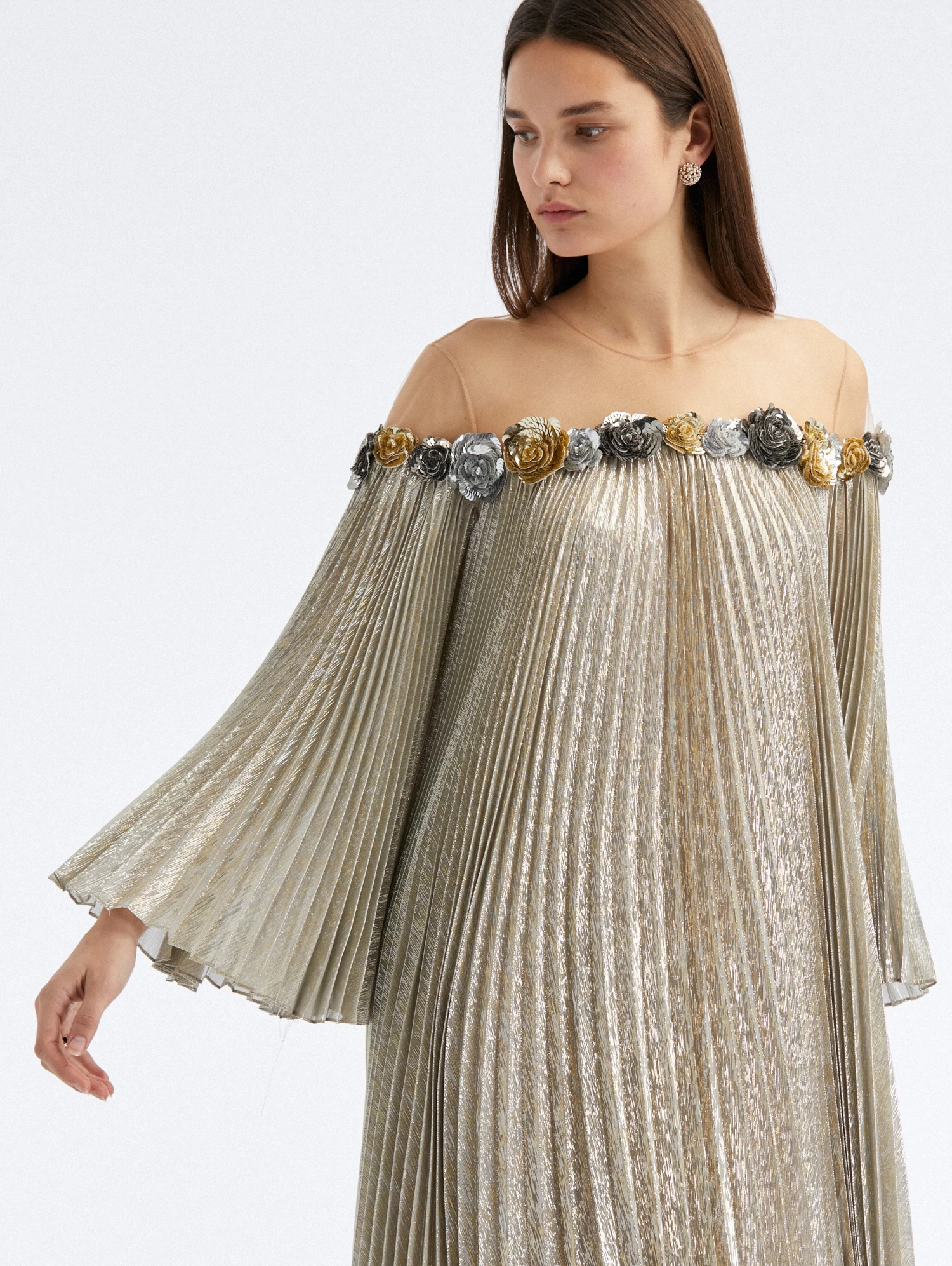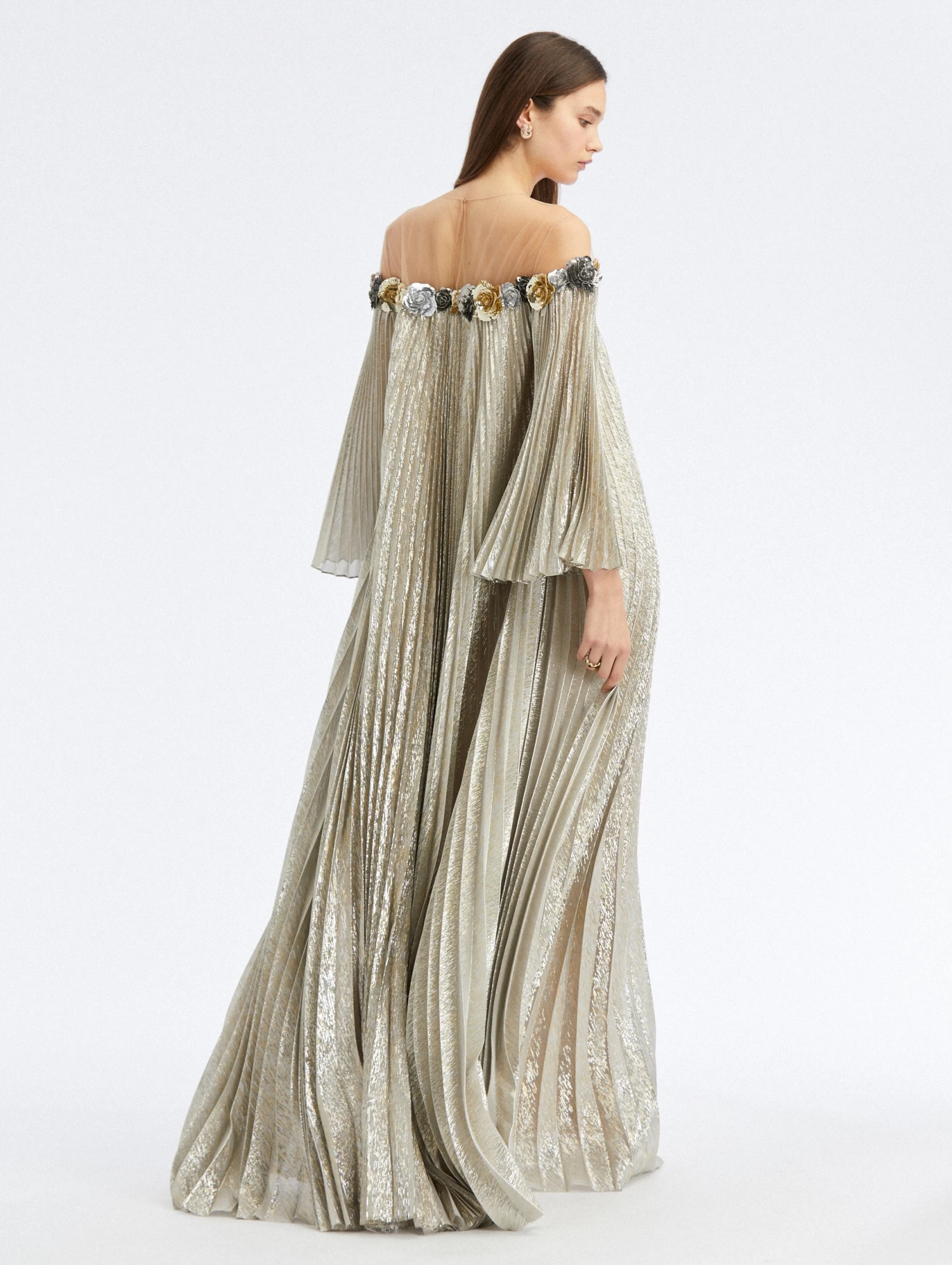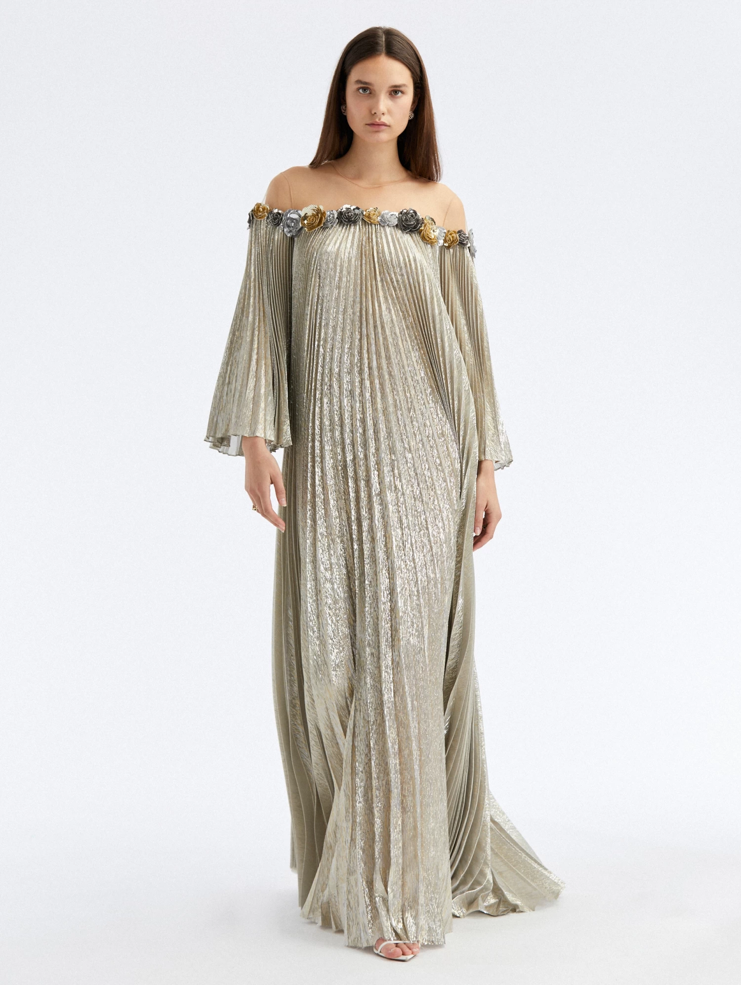 Cut from shimmering silver lamé mousseline, this floor-sweeping caftan is designed with voluminous sleeves and rosette sequin detailing that delicately lays under an illusion tulle neckline.