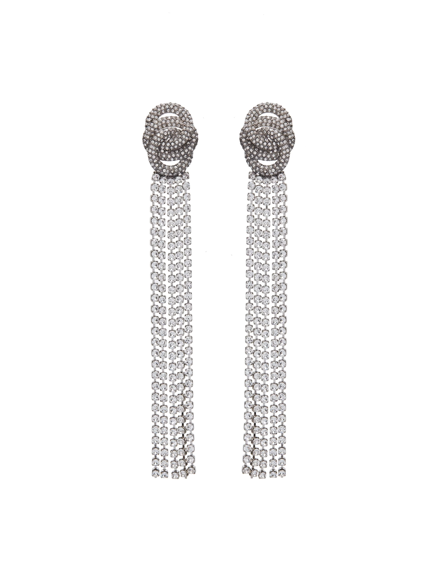 Delicate strands of glass crystals cascade from infinity link post backs for an opulent finish to evening looks.