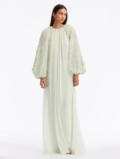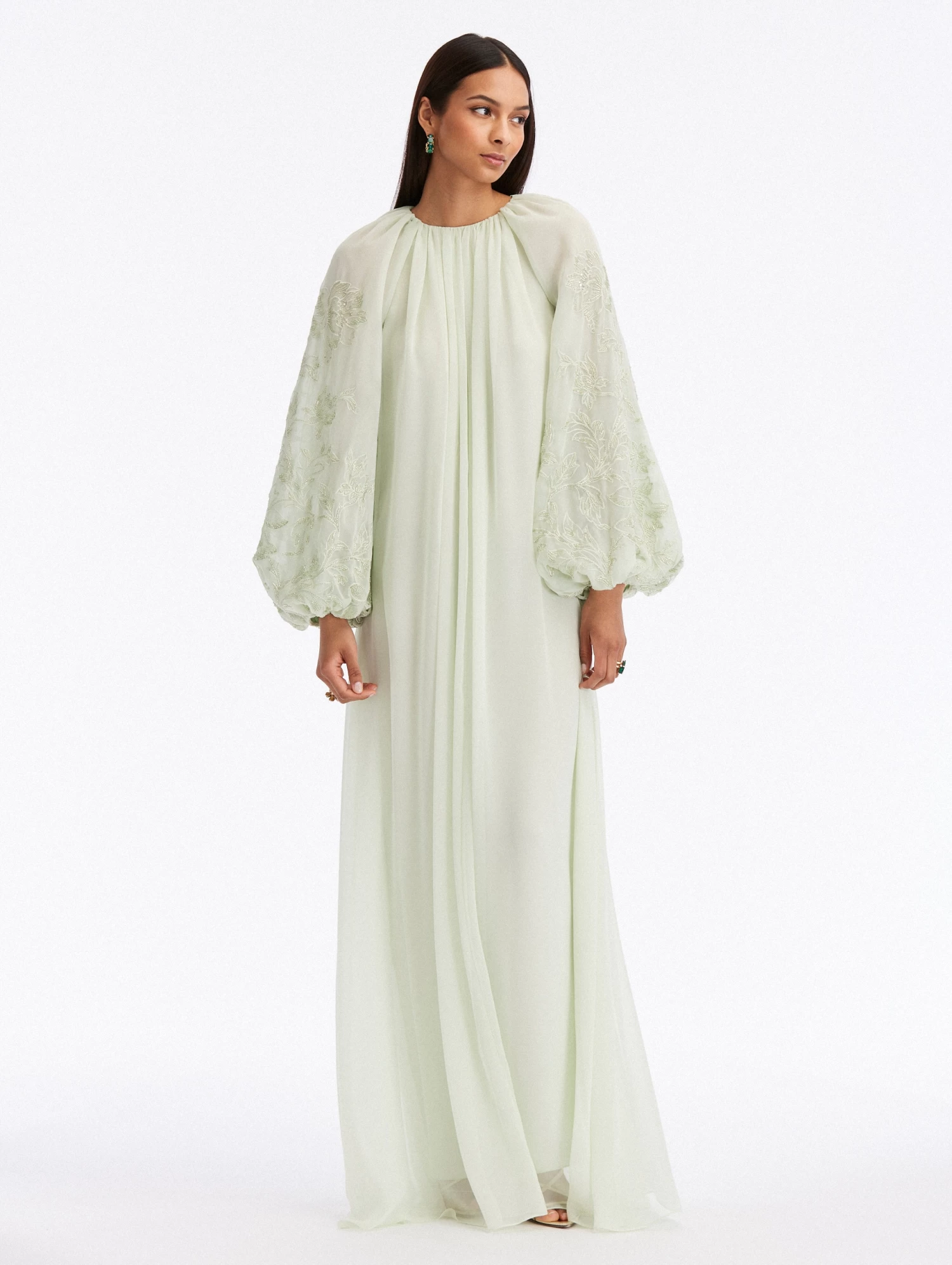 Balloon Long Sleeves / Jewel Neckline / Relaxed Silhouette / Floor-Sweeping Hemline / 100% Silk Lining Dry Clean