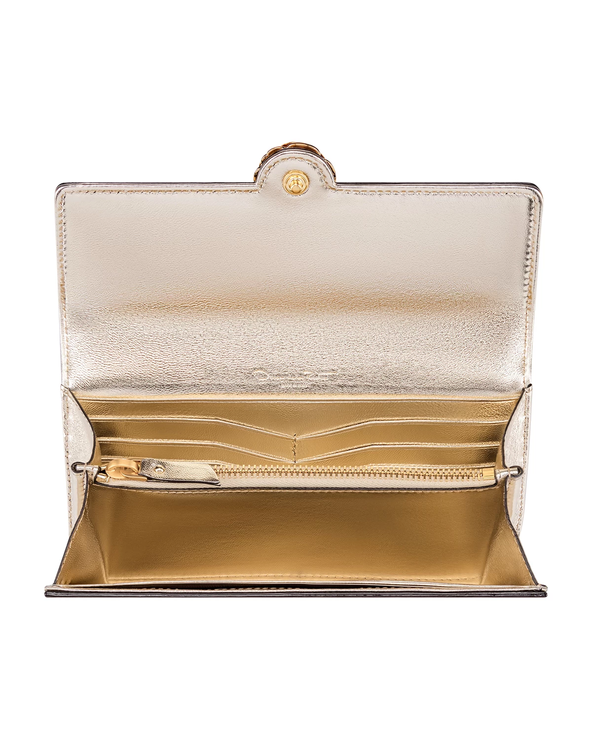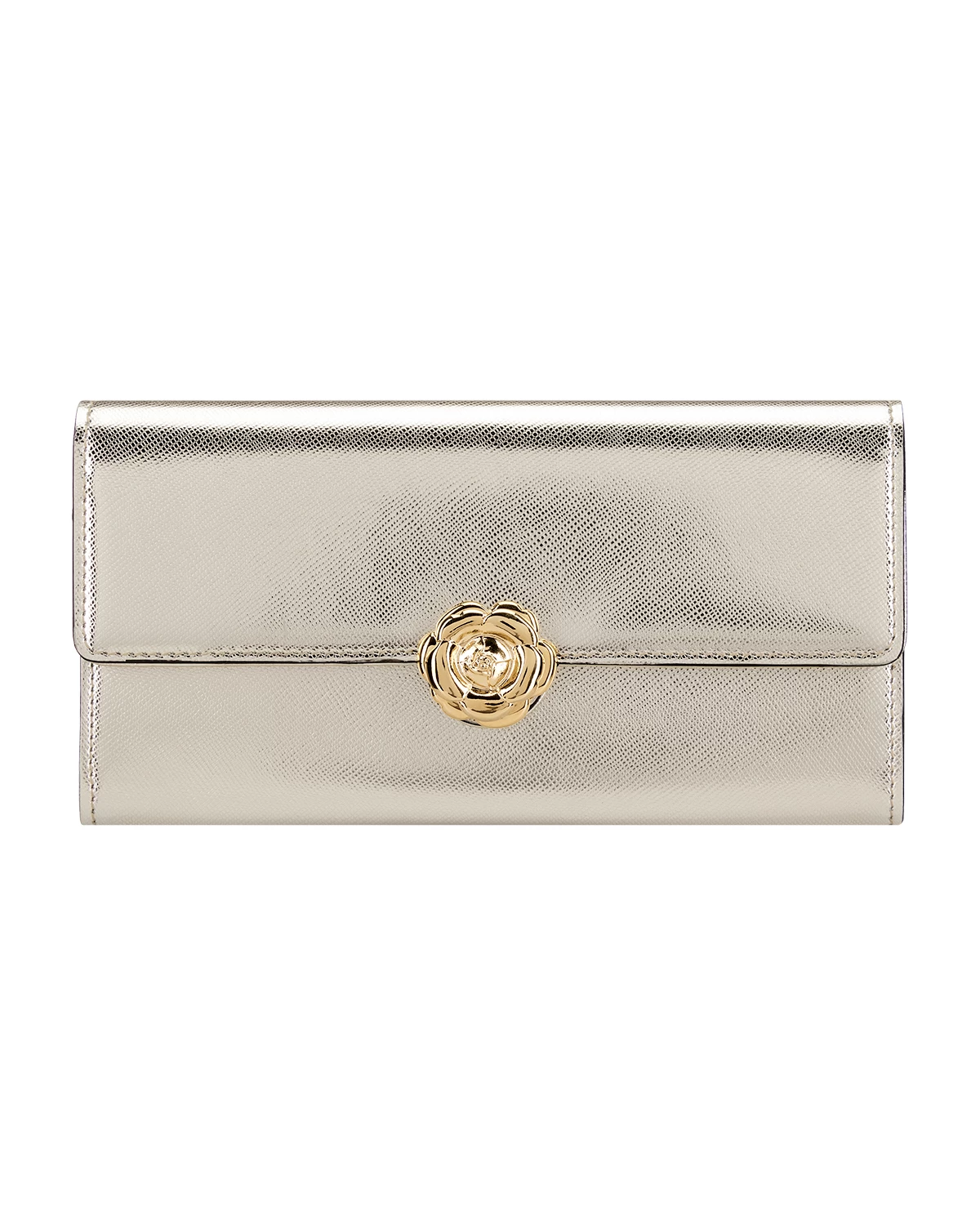 A continental wallet is an everyday essential. This classic style is crafted from light gold lamé leather with a gardenia at the clasp. Its divided interior has plenty of compartments to make it effortless to stay organized.