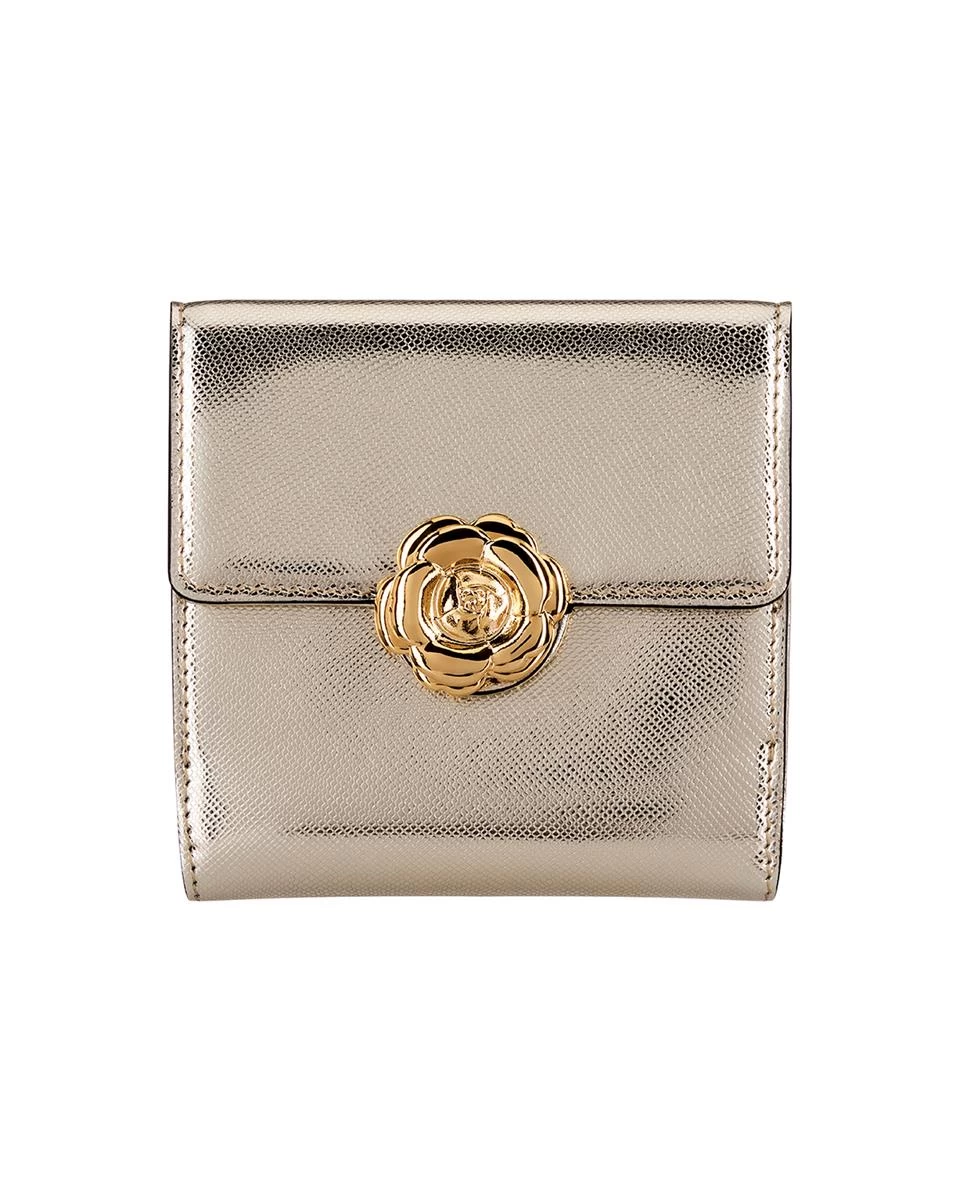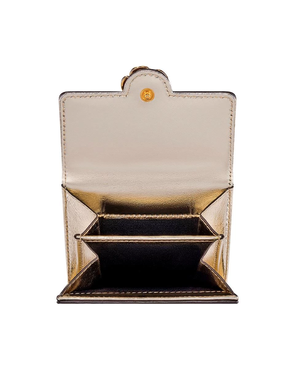 Crafted from light gold lamé leather, this scaled-down wallet is fitted with plenty of card slots and sleeves to keep organized and is finished with our signature gardenia flower.