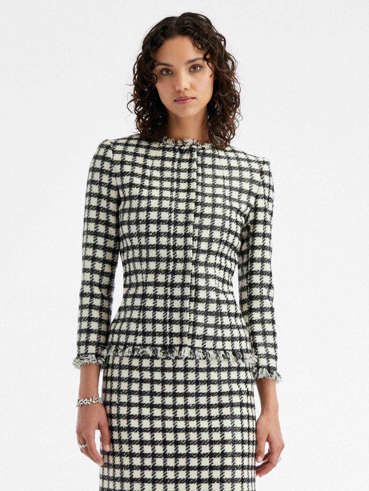 A luxe take on signature tweed styling, this jacket showcases a subtle metallic finish. With checked detailing and a fringed trim, this jacket is a versatile classic.