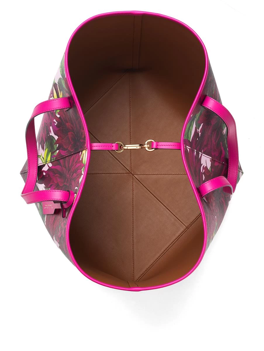 The perfect option for your everyday essentials or warm weather getaways, this medium square tote is crafted from dahlia printed leather with flat top handles and a removable logo-engraved tag.