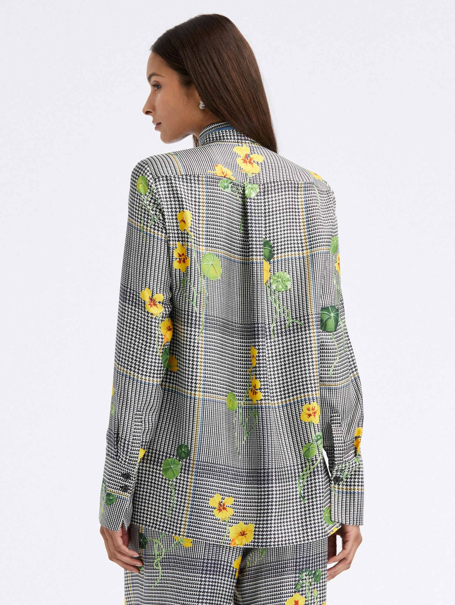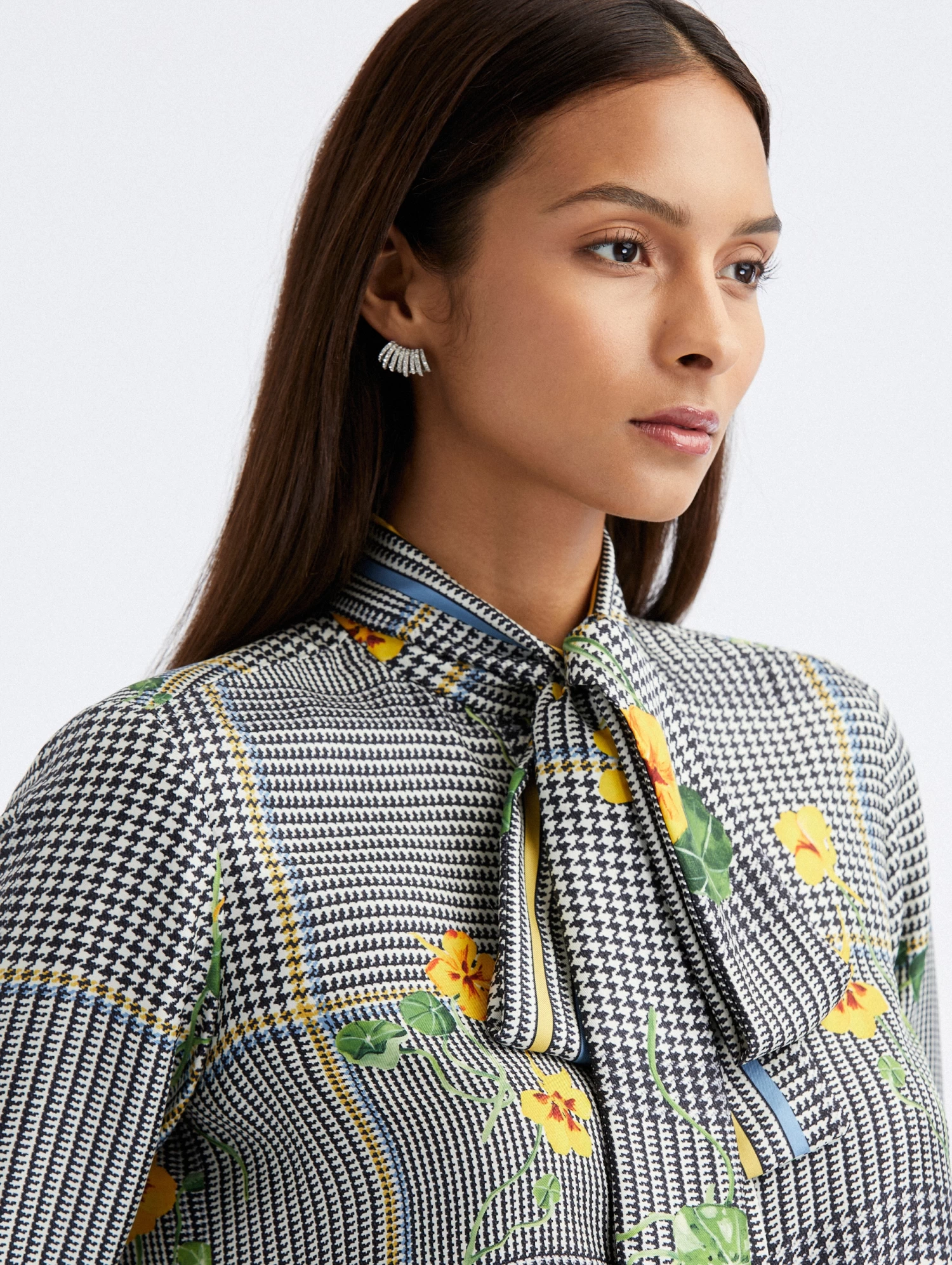 This tie-neck blouse is defined by the nasturtium plaid motif, a pillar of the Pre-Fall 2023 Collection. Cut of silk chiffon, this romantic blouse boasts a lighter-than-air construction.