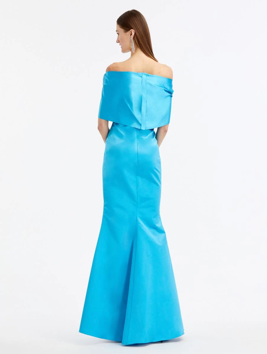 A sophisticated option for any special occasion, this gown is crafted from luxurious Caribbean-hued silk and features an exaggerated off-the shoulder neckline and feminine, fluted skirt.