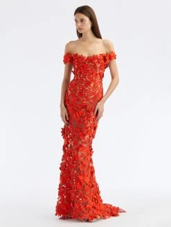 This dramatic, off-the-shoulder gown is defined by all-over floral threadwork embroidery in complement to a semi-sheer effect. With a flared skirt and short train, this pieces evokes the timeless femininity inherent to the house since its beginning.