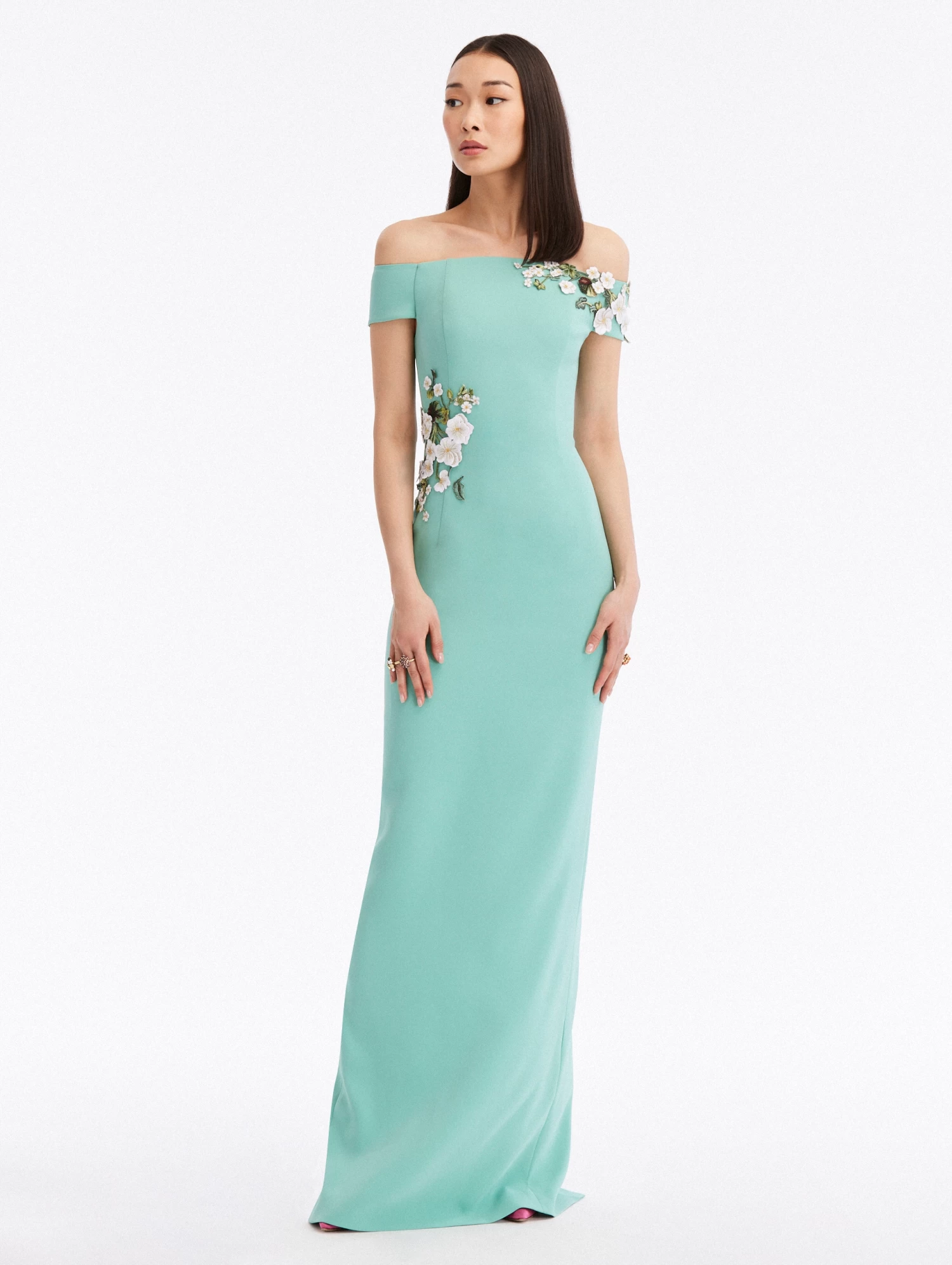 Complete with geranium threadwork embroidery at the front, this romantic gown is cut in a form fitting silhouette with an off-the-shoulder neckline.