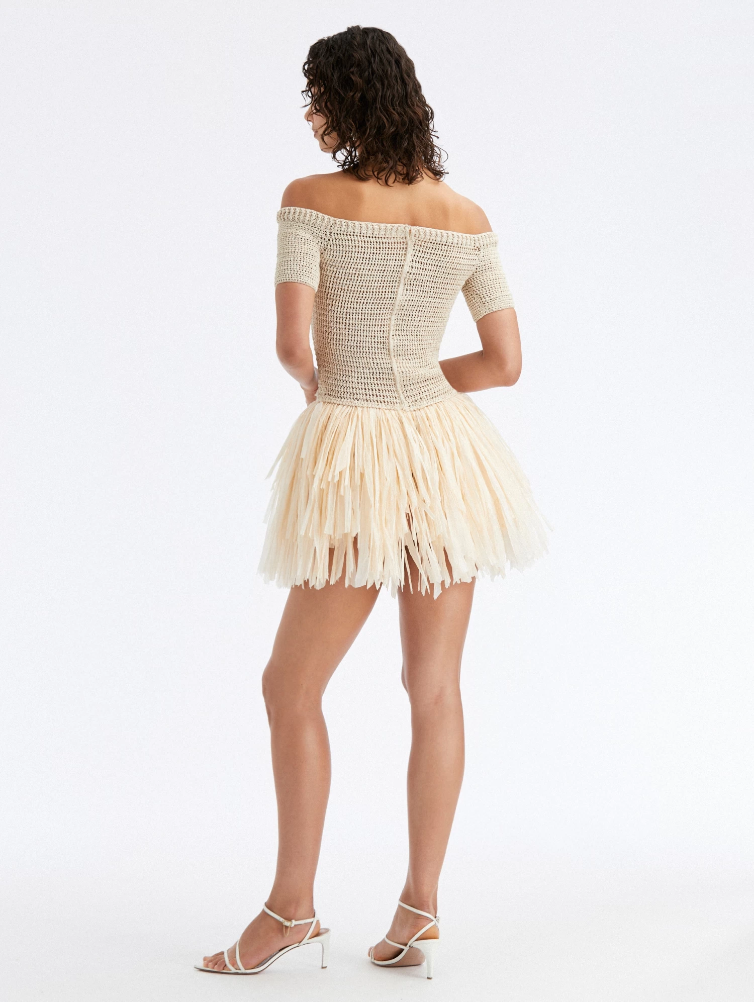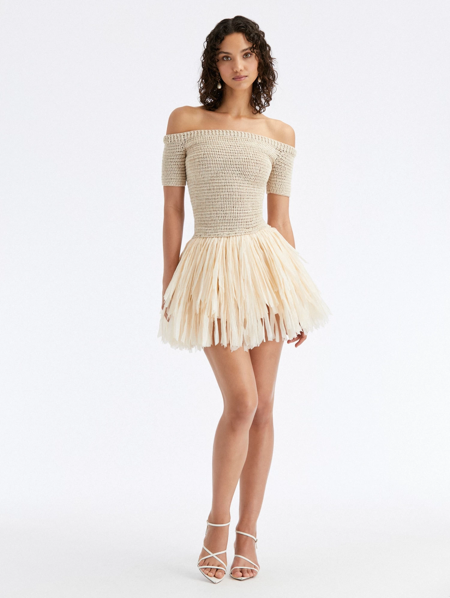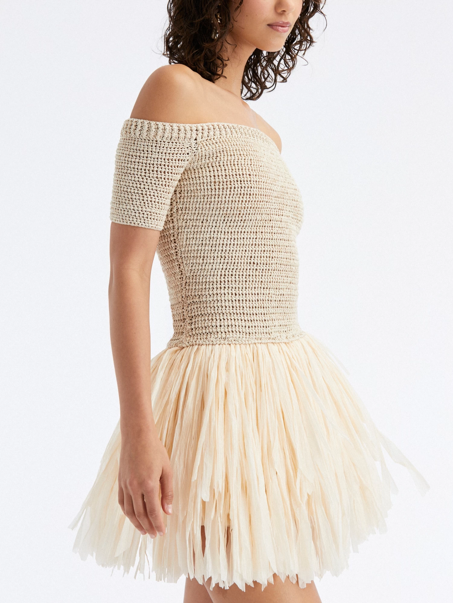 A testament to the house’s extraordinary craftsmanship, this dress features a knit bodice win contrast to a raffia fringed skirt.
