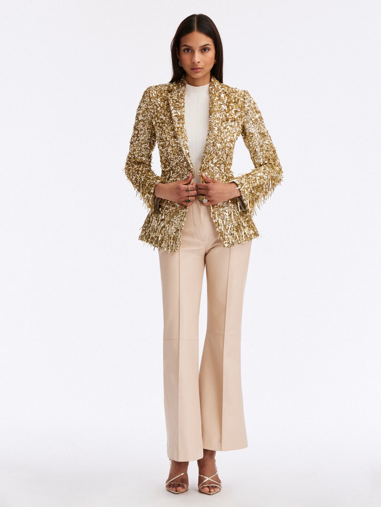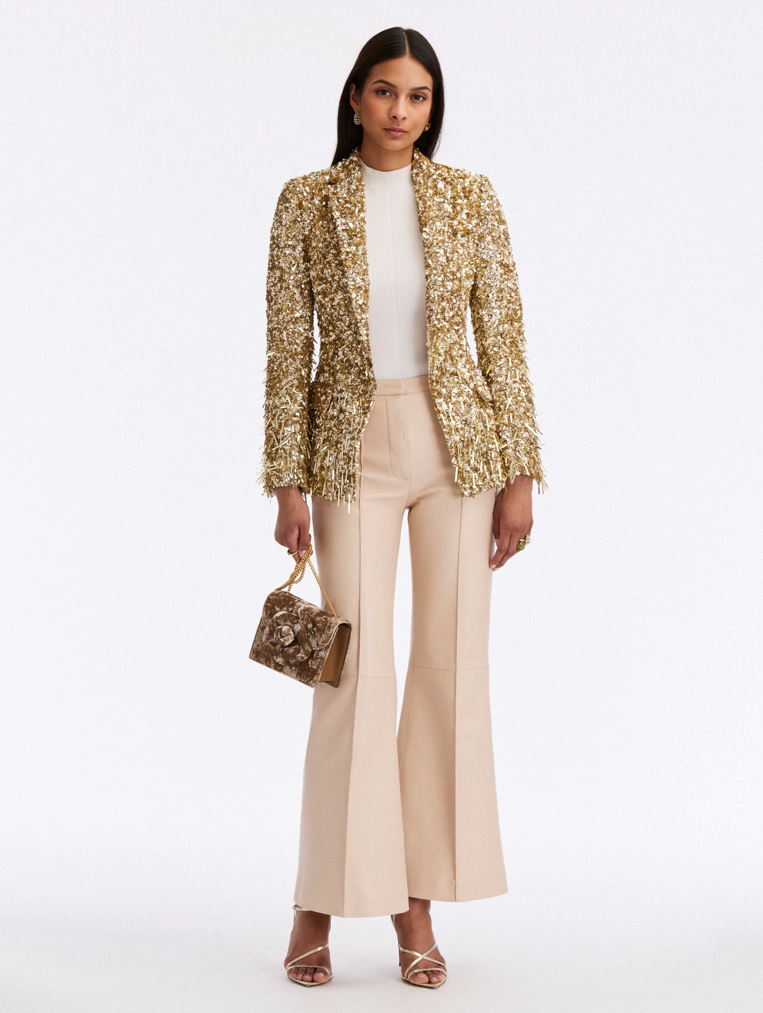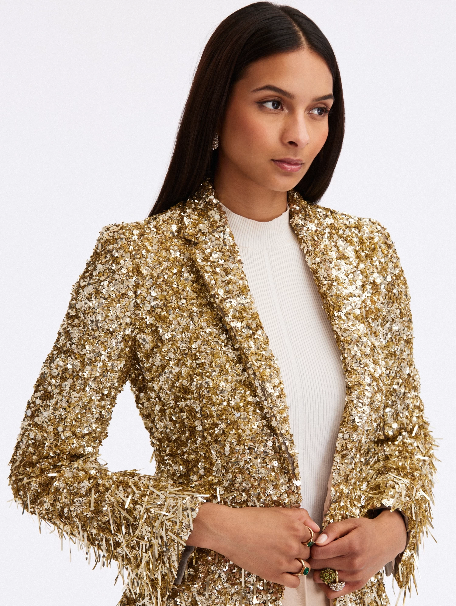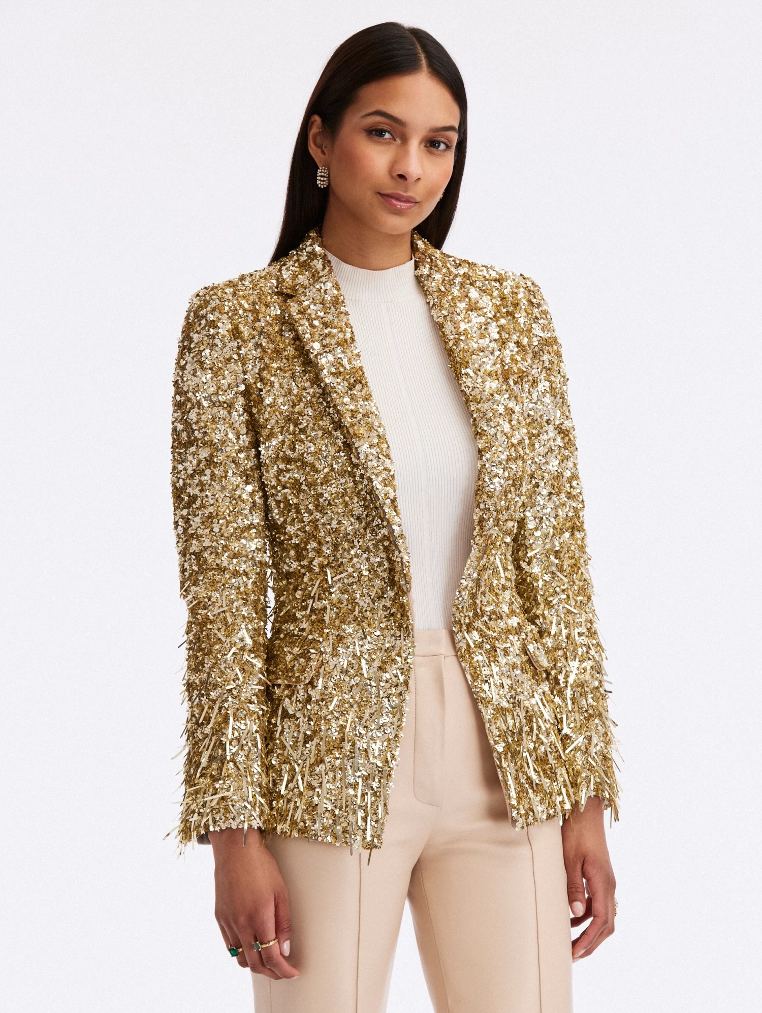 Decorated with all-over sequin & paillette embroidery, this elegant overlayer answers the call of any special occasion. Cut in a tailored silhouette, this piece is finished with a fringe trim and a center back slit.