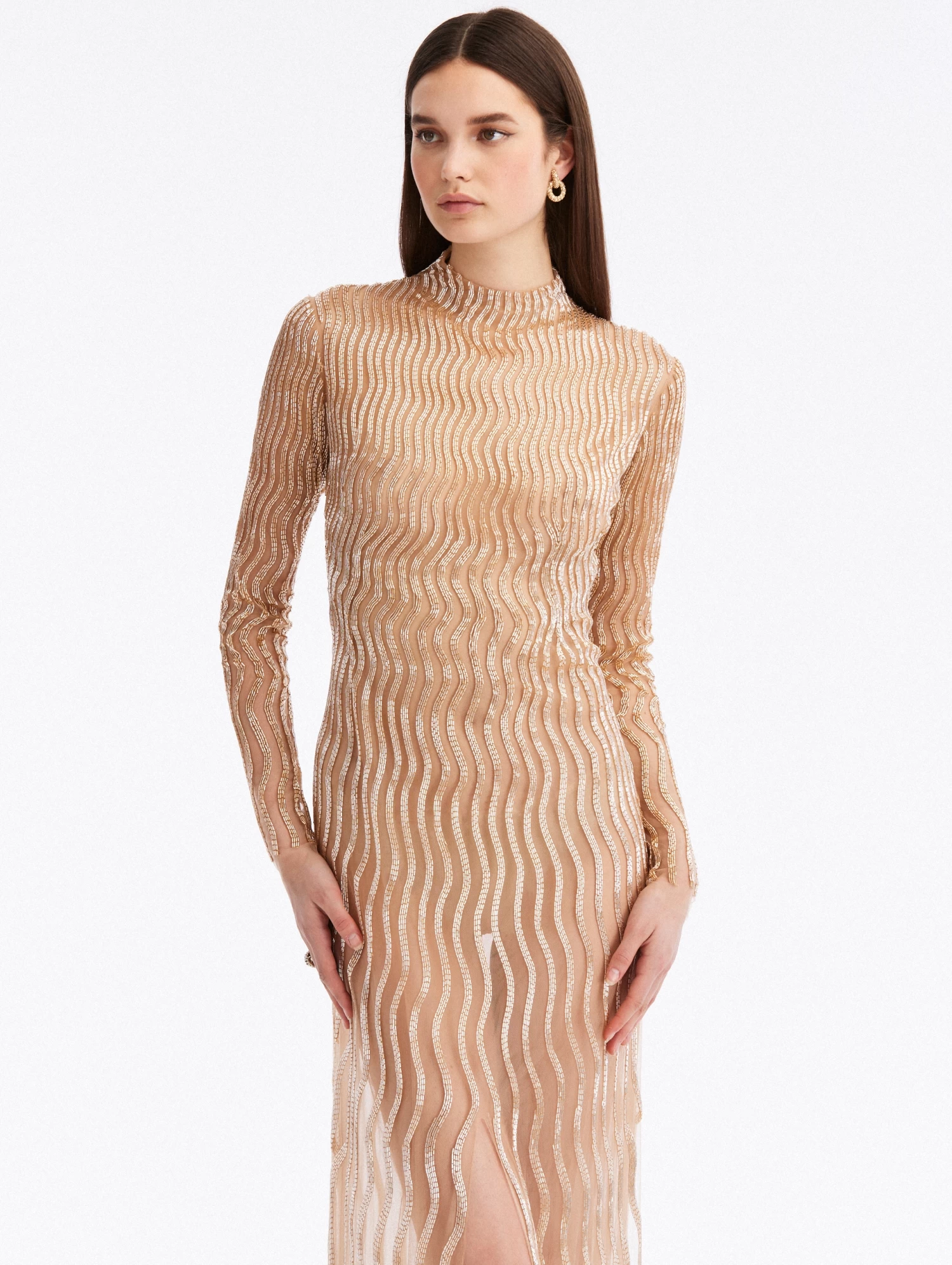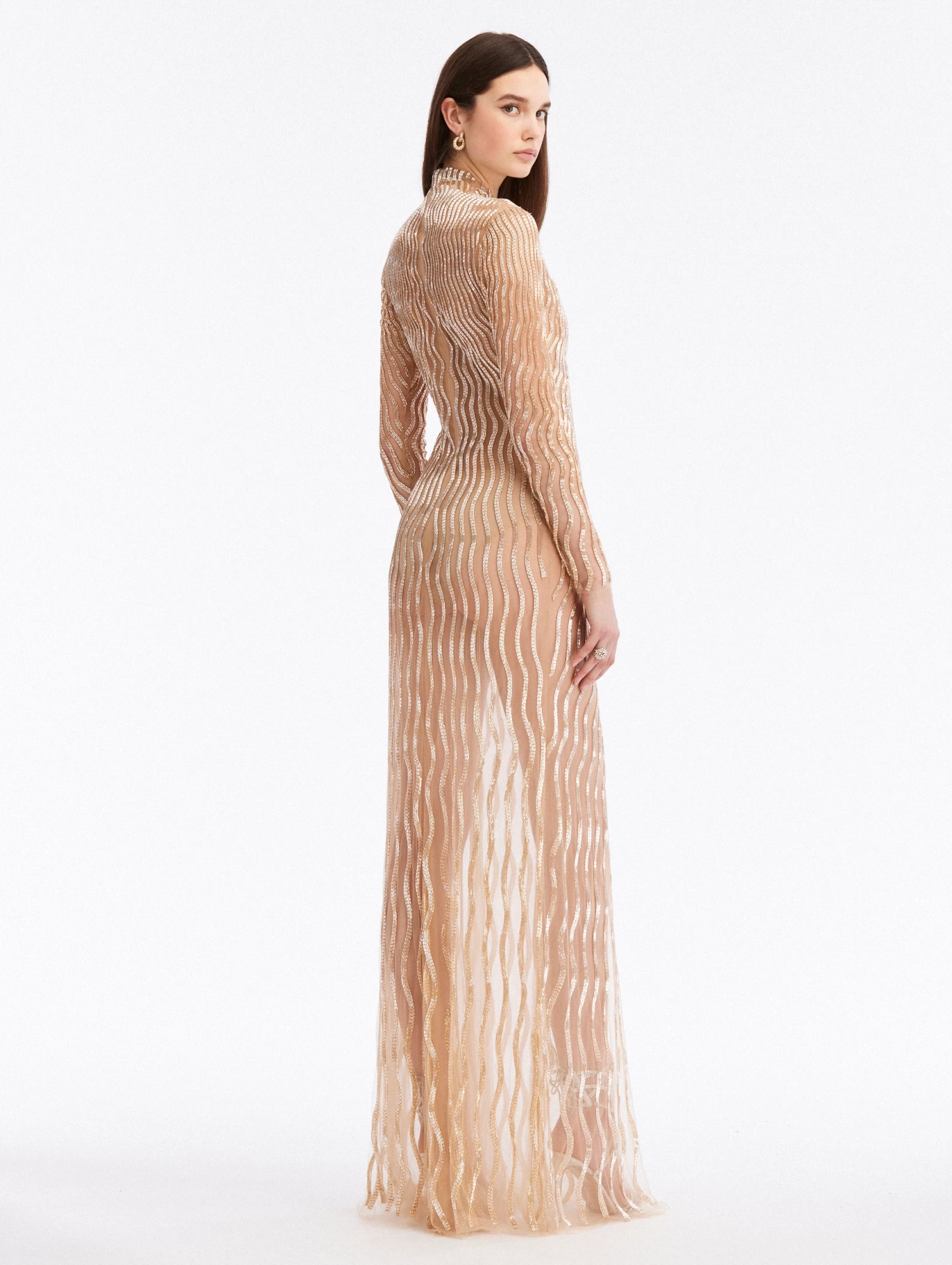 A romantic option for upcoming occasions, this long sleeve tulle gown boasts a wave-like construction with sequin embellishments.