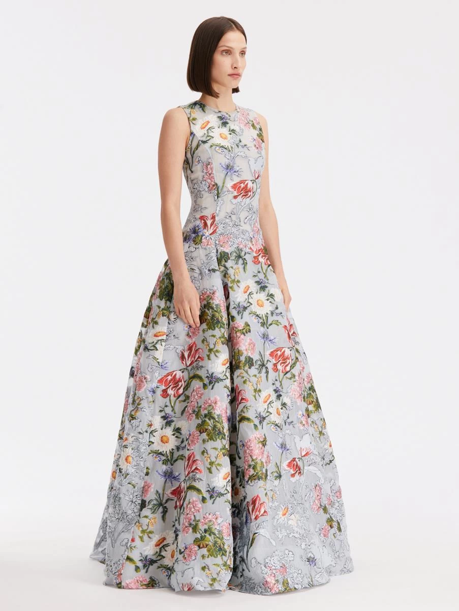 Decadent fil coupé is the canvas for this season’s painterly ‘unfinished’ floral motif. This floor-sweeping gown boasts a feminine full skirt and fitted bodice.