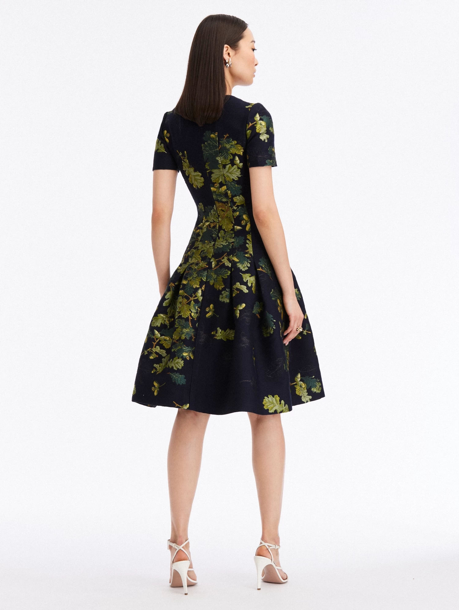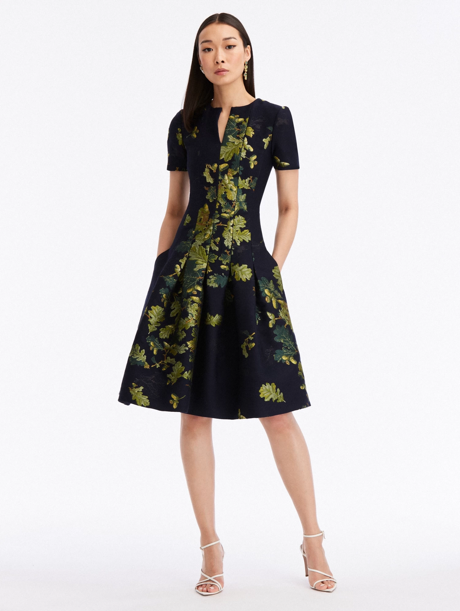 Rich with color and texture, this jacquard dress is defined by metallic acorn detailing. This dress features a split neckline and figure flattering seams that lead into soft pleats, creating a full skirt.