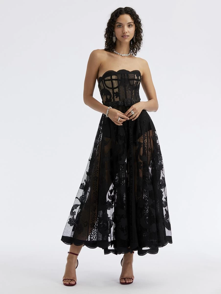 A romantic option for upcoming occasions, this strapless gown is crafted from delicate floral lace and features a feminine full skirt.
