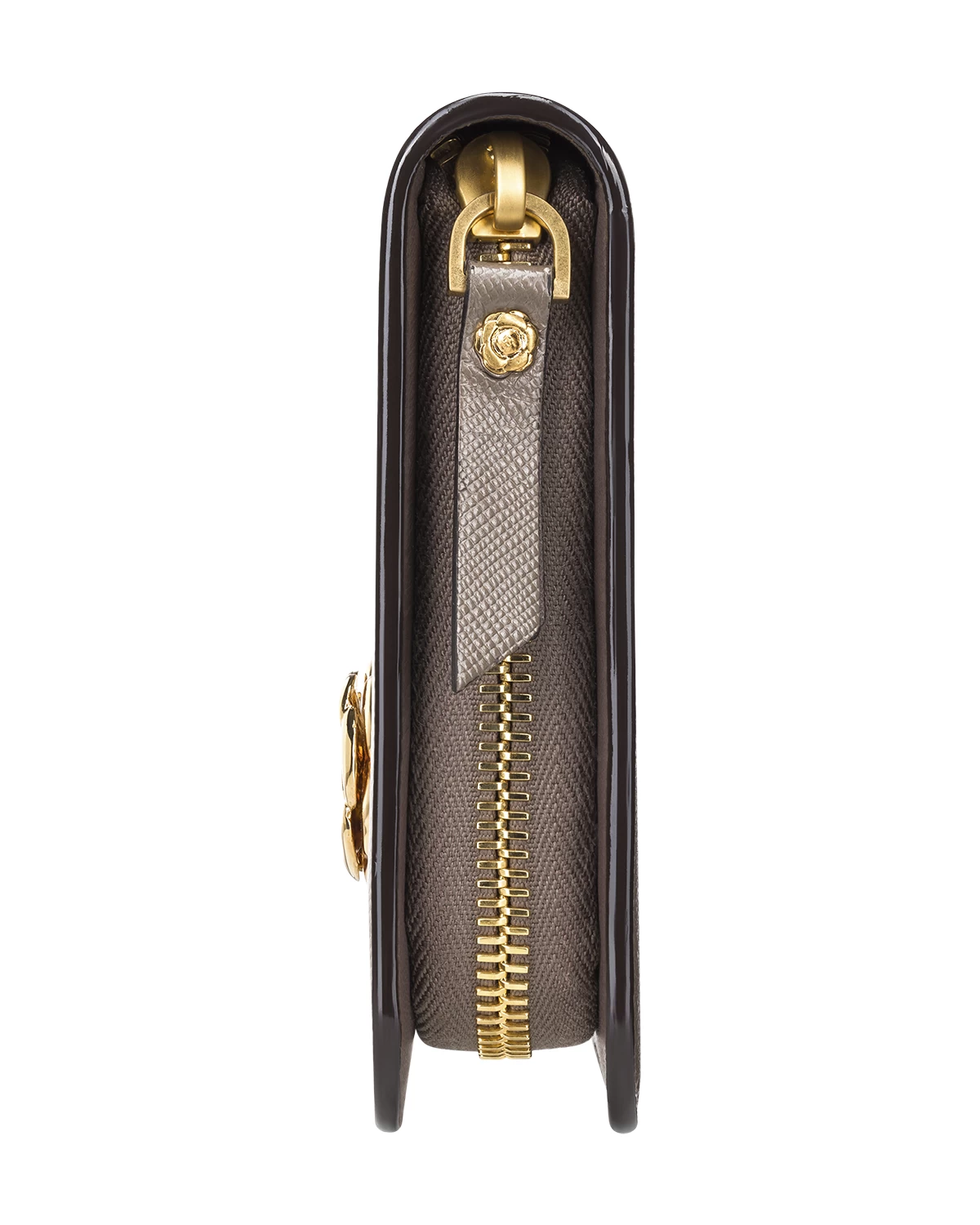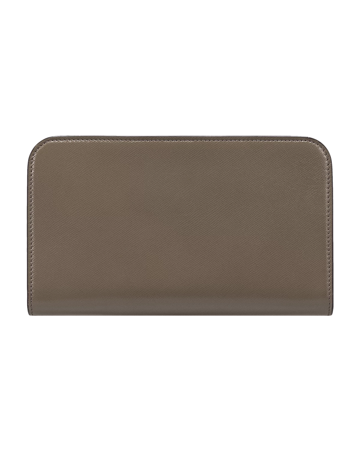 Our travel wallet is expertly designed with a place to put every note, card and receipt you need on-the-go. The sleek taupe Saffiano leather style is finished with our signature gardenia flower.