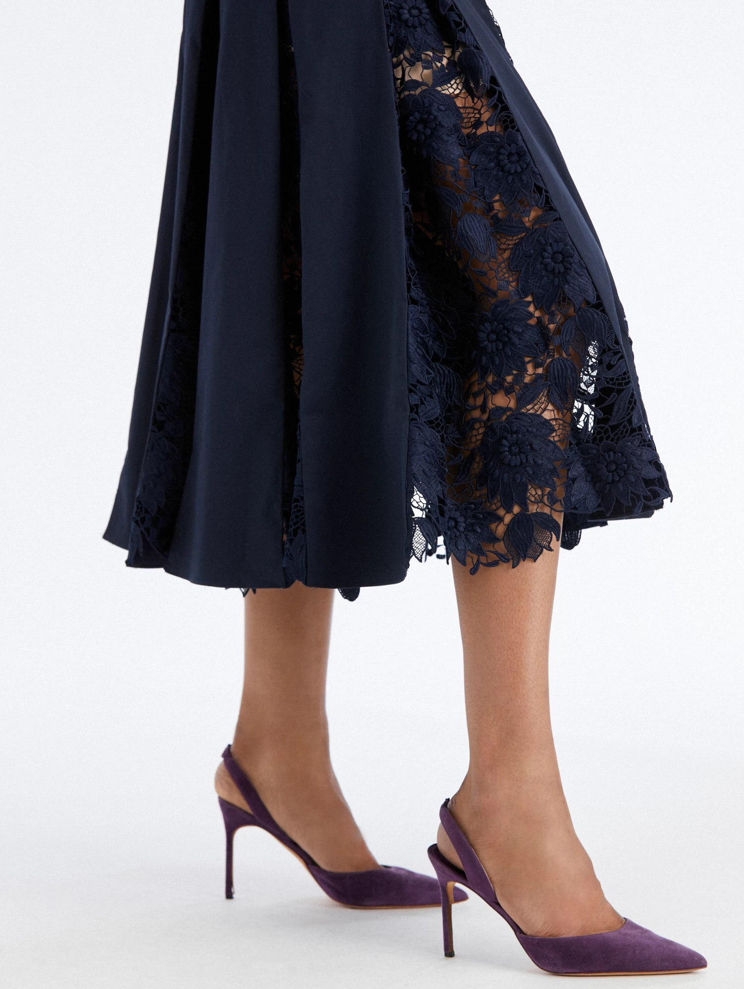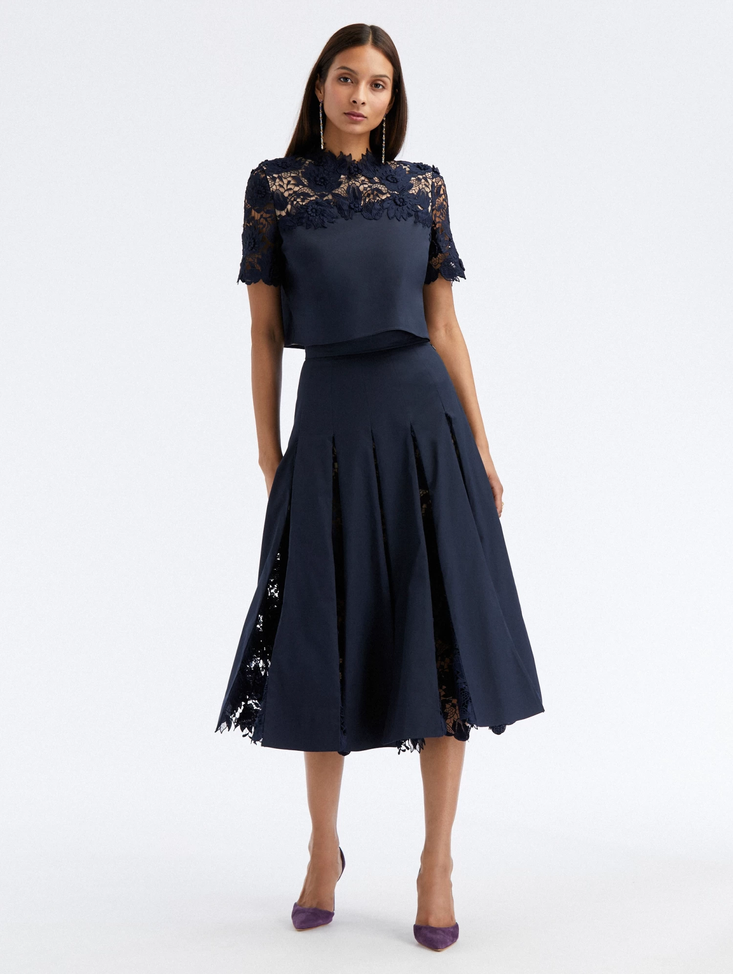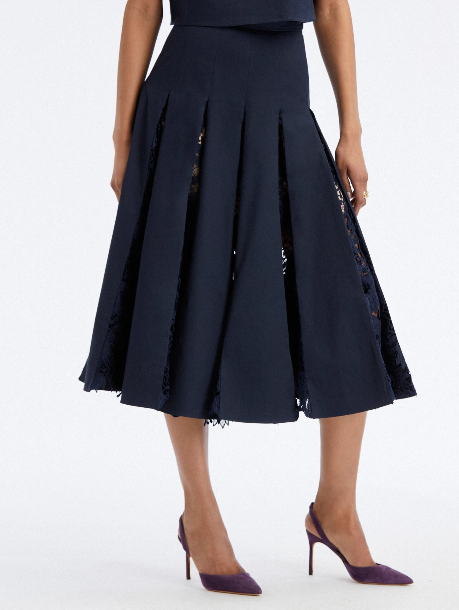 Crafted from breathable cotton poplin, this midi skirt is detailed with contrasting water lily guipure pleats that swish with every step. Pair with color complementing separates or with is coordinating top for optimal versatility.Runs small. Size up for best fit.