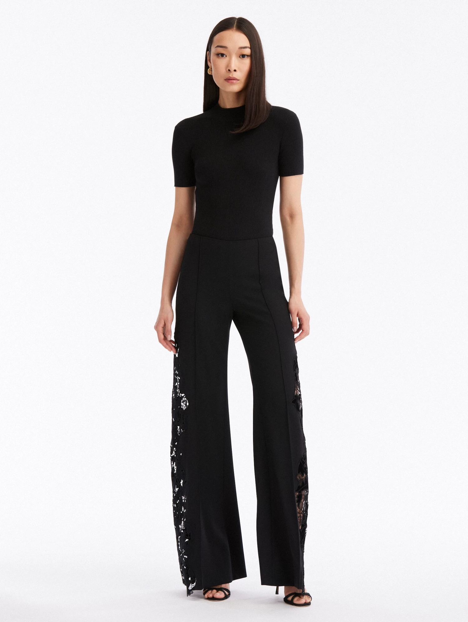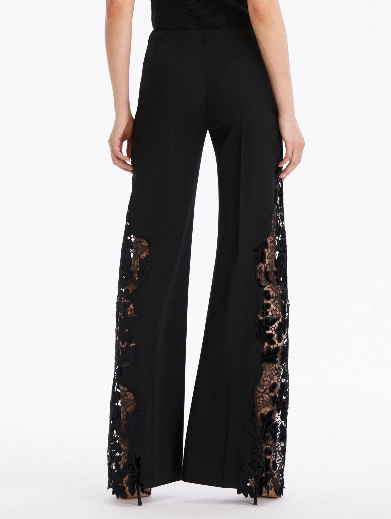 Cut in a high waisted silhouette, these wide leg pants feature perfectly placed floral lace inserts with pleating at the front.